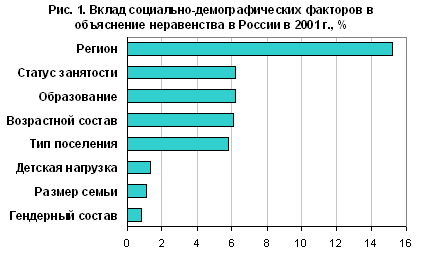 Рис. 1. Вклад социально-демографических факторов в объяснение неравенства в России в 2001 г. Источник: Вступление России в ВТО: мнимые и реальные социальные последствия / Под ред. Л.Н. Овчаровой. Серия «Научные проекты НИСП». - М., 2004, с. 58. |