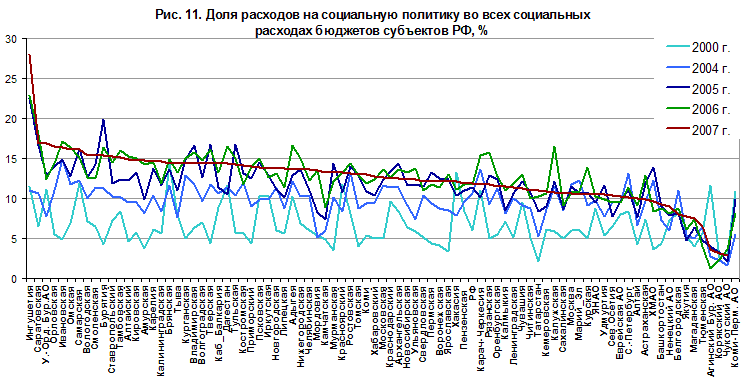 Еще один источник информации – бюджетная статистика Министерства финансов. Социальные расходы бюджетов субъектов РФ рассмотрены в тематическом разделе «Экономическое состояние и бюджетная политика», поэтому в данном разделе основное внимание уделено расходам на социальную политику, с помощью которой осуществляется поддержка уязвимых групп населения. Важнейшее изменение за 2000-2007 гг. – рост доли расходов на соцполитику в расходах бюджетов подавляющего большинства субъектов РФ. В 1990-е годы власти многих субъектов РФ экономили на социальной политике, «затыкая дыры» в ЖКХ и других секторах, поэтому ее доля в структуре социальных расходов бюджетов не превышала 5-7% вплоть до 2000 г. В начале 2000-х гг. значительная часть социальных выплат была переведена на федеральный уровень, регионы получали средства в виде целевых перечислений (субвенций), поэтому региональная «вольница» в социальной политике пошла на убыль, доля расходов в целом выросла и несколько выровнялась. Обеспечение более равного доступа населения разных субъектов РФ к социальной помощи – один из немногих примеров позитивного воздействия бюджетной централизации на положение бедных и уязвимых домохозяйств. Однако после вступления в силу ФЗ №122 в 2005 г. большая часть обязательств по поддержке социально незащищенных групп населения перешла к регионам без достаточных источников финансирования. Большинству субъектов РФ пришлось мобилизовать внутренние бюджетные ресурсы, вследствие чего доля расходов на социальную политику вновь выросла, хотя и не значительно по сравнению с началом 2000-х гг. При этом нельзя однозначно сказать, что чем беднее регион, тем выше доля расходов на социальную политику во всех его расходах, структурные показатели существенным образом зависят от приоритетов региональных властей (рис. 11). Есть несколько регионов, в которых социальная политика остается даже не на вторых, а на третьих ролях. В основном это регионы Крайнего Севера (Якутия, Чукотский АО и др.), расходующие значительные средства на социальную инфраструктуру, а не на социальные выплаты. Другой пример – регионы с очень значительным ростом доходов бюджета в последние годы (Тюменская область и Агинский Бурятский АО), что привело к снижению в них доли расходов на соцполитику. То же самое происходило в 2004-2005 гг. в Мордовии и на Чукотке. В России в целом и в ее регионах не принято пропорционально перераспределять существенно возросшие доходы бюджетов на политику поддержки социально уязвимых групп населения.
