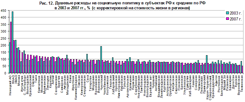 Лидерами по душевым расходам на социальную политику до 2006 г. были нефтегазодобывающие автономные округа Тюменской области, но после того, как они потеряли важнейший источник доходов – налог на добычу полезных ископаемых (НДПИ), их социальные расходы стали менее сильно выделяться по сравнению с другими регионами страны (рис. 12). Зато в 2007 г. резко «рванули» вверх расходы на соцполитику в другом нефтяном регионе – Ненецком АО. В результате разрыв в душевых показателях по регионам, сократившийся за 2003-2006 гг. с 8 до 5 раз (с корректировкой на стоимость жизни), вновь вырос до 7,2 раз. Тенденция выравнивания в финансировании социальной политики важна и позитивна, поскольку именно социальная политика нацелена на поддержку уязвимых групп населения. Однако различия душевых бюджетных расходов в этой сфере пока смягчаются не за счет подтягивания слабых регионов, а за счет относительного снижения показателей регионов-лидеров. Помимо богатых сырьевых регионов, более масштабной социальной политикой отличаются федеральные города: в Москве душевой показатель расходов на соцполитику превышает среднероссийский в 1,6 раза (в начале 2000-х гг. превышение было двукратным), в Санкт-Петербурге – в 1,4 раза. Минимальными душевыми расходами (менее 2/3 от средних по стране) отличаются не только бедные республики юга, но и часть более южных краев и областей, а также республика Башкортостан. Аутсайдерами их делает не только слаборазвитость, большее или меньшее количество получателей разных видов помощи, но в немалой степени – и выбор региональными властями приоритетов бюджетной политики.