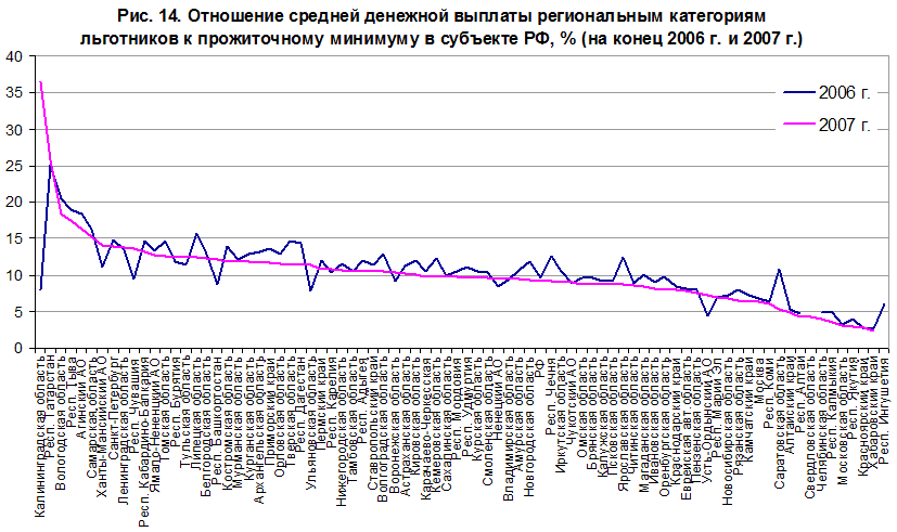Рис. 14. Отношение средней денежной выплаты региональным категориям льготников к прожиточному минимуму в субъекте РФ, % (на конец 2006 г. и 2007 г.) |