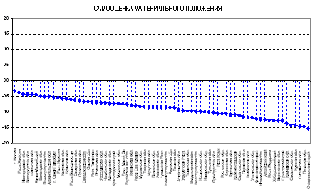 Более сложная интегральная самооценка материального положения рассчитывается по четырем вопросам (самооценка материального положения, его улучшение/ухудшение за прошедший год, ожидания на перспективу, самооценка достаточности доходов) с перекодировкой (позитивные оценки получали балл выше 0, негативные – ниже 0). Методика интегрирования описана в презентации на сайте Московского центра Карнеги. Весьма показательны отрицательные значения интегральной самооценки по всем регионам, но нам более интересны региональные различия (рис. 16). В них отчасти воспроизводится тот же спектр отличий от статистических оценок, как и описанный выше, но добавляются и новые: например, в число лидеров попали Новгородская область с невысокими статистическими показателями доходов населения и сверхпроблемная Читинская область, они опережают по интегральной самооценке материального положения не только С.-Петербург, но и один из самых «богатых» субъектов РФ – Ханты-Мансийский АО. Столь неожиданный результат можно списать на дефекты выборки лишь отчасти. Опросы, проведенные в Ханты-Мансийском округе местными социологами в 2003-2004 гг., выявили ту же особенность – наиболее критично оценивали свое материальное положение и остроту жизненных проблем жители относительно благополучных нефтяных городов, а сельское население, живущее за пределами основных районов добычи нефти, было настроено более позитивно. В этом и проявляется субъективность оценок населения с разными потребностями и образцами для подражания.