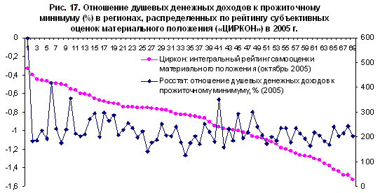 Благодаря работе социологов впервые появилась возможность сравнить объективные статистические показатели Росстата с самооценками населения, полученными в опросах ФОМ, а также различными интегральными оценками социального самочувствия, разработанными группой «ЦИРКОН» на основе этих опросов. При построении социологических индексов использовались данные двух последних опросов, проведенных в апреле и октябре 2005 года, поэтому для сравнений используются статистические данные за 2005 г., при отсутствии таковых – за 2004 г.