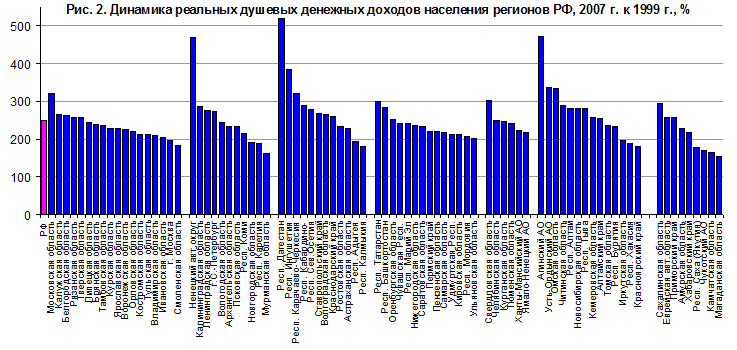 Рис. 2. Динамика реальных душевых денежных доходов населения регионов РФ, 2007 г. к 1999 г., в % |