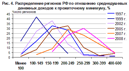 Благодаря экономическому росту и увеличению объемов федеральной помощи стало значительно меньше регионов с минимальным соотношением доходов и прожиточного минимума (менее 1,5 раз): в 2001 г. к ним относилась четверть регионов страны, в 2007 г. осталось только три – республики Ингушетия, Калмыкия и недавно объединенный Усть-Ордынский Бурятский АО, статистику по которому перестали публиковать с 2008 г. В некоторых наиболее бедных регионах (республики Ингушетия, Адыгея, Калмыкия, Алтай, Ивановская область) в 2008 г. был отмечен опережающий рост покупательной способности доходов, в том числе благодаря повышению оплаты труда работников бюджетного сектора, которые в слаборазвитых регионах составляют самую большую группу занятых. В результате в настоящее время только в шести регионах показатель не превышает двух раз. В последние годы изменилась география аутсайдеров – в основном это регионы востока страны, республики Поволжья и только две республики Северного Кавказа – Адыгея, в которой преобладает русское население, и сверхпроблемная Ингушетия (данные по Чечне не публикуются). Остальные республики Северного Кавказа имеют более высокие показатели, это явное свидетельство особого внимания к проблемным территориям со стороны федеральных властей.