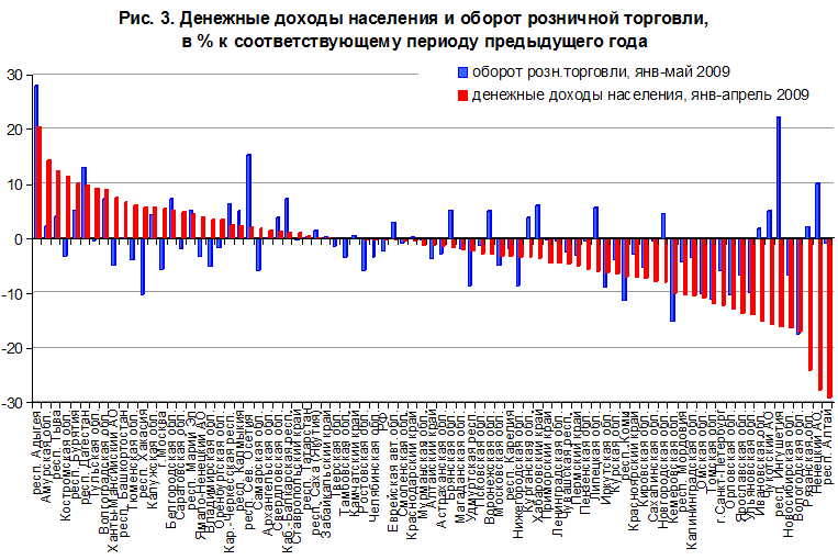 Относительную достоверность данных подтверждает и сопоставление динамики доходов населения по регионам с динамикой потребления – оборотом розничной торговли (рис. 3): явной связи между двумя показателями нет. В целом по стране оборот торговли за январь-май 2009 г. (к соответствующему периоду 2008 г.) сократился чуть сильнее, чем доходы населения – на 2,2%. При этом география показателя более понятна: рост оборота торговли сохранился в подавляющем большинстве регионов Юга и Дальнего Востока, менее всего затронутых кризисом. Наоборот, большинство регионов Центра и Приволжского ФО сократили потребление, что согласуется с максимальными темпами их промышленного спада.