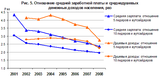 Можно сравнить тенденции заработной платы с душевыми доходами населения, которые рассчитываются на основе других источников информации – не отчетности предприятий и организаций, а выборочных обследований бюджетов домохозяйств и корректировки этих данных балансовым методом. Аналогичное сопоставление регионов-лидеров и аутсайдеров по душевым денежным доходам с поправкой на стоимость жизни в регионах (прожиточный минимум) показывает, что эти региональные различия, во-первых, больше, а во-вторых, вплоть до 2007 г. сокращались более медленно. Только для групп из пяти полярных регионов темпы сокращения были сопоставимы с динамикой снижения различий в заработной плате, причем только в последние три года, а для десятки лучших и худших тенденция сокращения почти не улавливалась. Лишь в 2008 г. благодаря «подтягиванию» доходов в отстающих регионах и некоторой стагнации лидеров разрыв в душевых доходах заметно сократился.