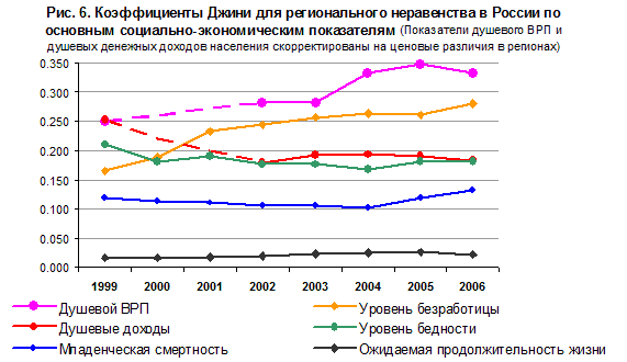 Рис. 6. Коэффициенты Джини для регионального неравенства в России по основным социально-экономическим показателям, взвешенные на численность населения регионов (Показатели душевого ВРП и душевых денежных доходов населения скорректированы на ценовые различия в регионах) |
