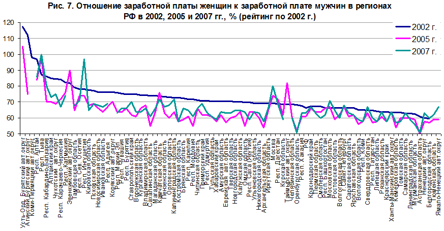 Рис. 7. Отношение заработной платы женщин к заработной плате мужчин в регионах РФ в 2002, 2005 и 2007 гг., % (рейтинг по 2002 г.) |