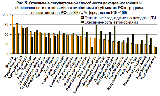 Сравнения покупательной способности доходов и обеспеченности легковыми автомобилями на 1000 населения не всегда подтверждают тесную взаимосвязь между текущими доходами и накопленным имуществом. На рисунке 8 регионы с максимальным и минимальным отношением душевых доходов населения к прожиточному минимуму за 2006 г. сопоставлены с обеспеченностью автомобилями в них (все показатели рассчитаны относительно среднего по РФ). Судя по высокой автомобилизации, недооценены доходы жителей Подмосковья – многие из них работают в столице и имеют более высокие заработки, не фиксируемые статистикой. Такая же картина в Ленинградской области, где покупательная способность доходов заметно ниже среднероссийской, а обеспеченность автомобилями превышает средние показатели. Явно недооценены доходы жителей южных «русских» регионов (Краснодарского и Ставропольского краев) и республики Адыгея, имевших повышенную обеспеченность личным транспортом и в советское время. В депрессивной Ивановской области несовпадение двух индикаторов также вызывает сомнения в точности оценки доходов населения. Схожая ситуация и в Калмыкии, где обеспеченность автомобилями вдвое выше, чем покупательная способность доходов (относительно средних значений по стране). В то же время в наименее развитых республиках – Ингушетии и Дагестане - низкая обеспеченность автомобилями либо совпадает с низким уровнем доходов, либо показывает, что доходы завышены статистическими дооценками. Сравнение опровергает расхожее мнение о больших теневых доходах всех жителей республик юга.
