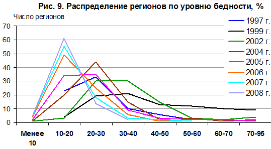 Распределение регионов по уровню бедности только в 2004 г. вернулось к додефолтным показателям 1997 г. (рис. 9), на полтора года позже, чем распределение отношения доходов к прожиточному минимуму. Это означает, что практически во всех регионах малообеспеченные группы населения оказались отодвинутыми от растущего денежного «пирога», преобладающая часть доходов распределялась не в их пользу, социальная поддержка малообеспеченных групп населения была недостаточно эффективной. На фоне повышения стандартов потребления основной части населения малообеспеченные домохозяйства ощущают собственную бедность и социальную исключенность еще острее.