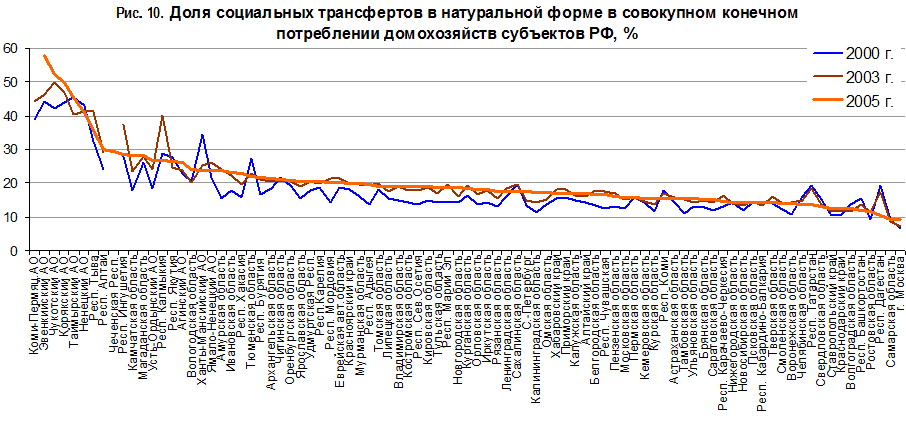 Из слаборазвитых республик юга высокую долю социальных трансфертов имеют только Чечня, Ингушетия и Калмыкия, это объясняется политическими приоритетами федеральных властей. В остальных республиках вклад социальных трансфертов в конечное потребление почти не отличается от среднего по субъектам РФ, потому что на юге короче отопительный сезон и ниже заработная плата занятых в отраслях социальной сферы. По той же причине понижена доля социальных трансфертов в совокупном потреблении домохозяйств других, более развитых, регионов юга. Еще один удешевляющий фактор – высокая концентрация населения, поэтому в регионах с большими городскими агломерациями доля социальных трансфертов государства также невелика. Самые низкие показатели имеют федеральная столица и Самарская область (9%). Причина не только в агломерационном эффекте, но и в методике расчета ВРП, завышающей личное потребление домохозяйств в этих субъектах – его нельзя «очистить» от расходов жителей других регионов, приезжающих в Москву за покупками, а в Тольятти и Самару за автомобилями. Завышение объемов личного потребления приводит к формальному снижению доли государства в фактическом конечном потреблении домохозяйств.