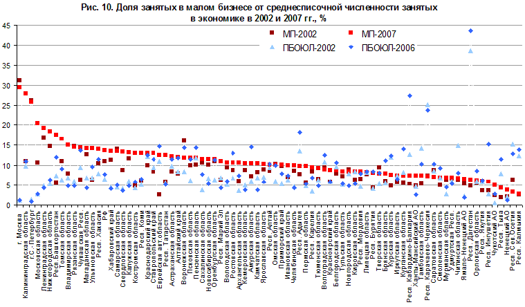 | | Рис. 10. Доля занятых в малом бизнесе от среднесписочной численности занятых в экономике в 2002 и 2007 гг., % |