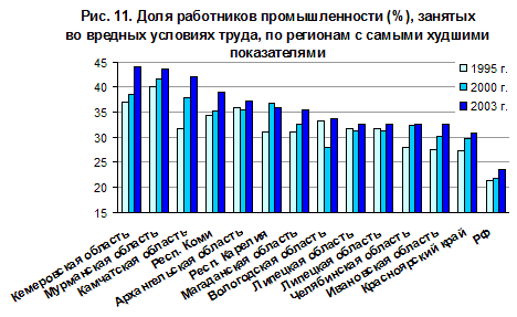 В переходный период основой российской экономики стали сырьевые отрасли промышленности и экологически грязные отрасли первого передела (металлургия, химия). При такой структуре экономики невозможно решить одну из наиболее острых проблем – очень высокую занятость во вредных условиях труда. В целом по стране в 2003-2004 гг. почти четверть занятых в промышленности (в т.ч. 29% мужчин и 16% женщин) работали во вредных условиях труда. Региональные различия определяются специализацией экономики: во всех ресурсодобывающих регионах Европейского Севера, Сибири и Дальнего Востока, в металлургических регионах (Липецкой, Челябинской, Свердловской, Оренбургской, Кемеровской областях, Красноярском крае) во вредных условиях работали от трети до половины мужчин, занятых в промышленности.