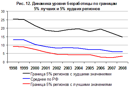 Региональная динамика общей безработицы совпадала с общероссийским трендом, наиболее высокие показатели во всех регионах отмечались в 1998-1999 гг., при этом в период кризиса 1998 г. различия между регионами уменьшились, поскольку рынки труда развитых регионов с исходно более низкой безработицей, как правило, сильнее реагируют на изменения макроэкономической ситуации. С улучшением состояния рынка труда межрегиональные различия, наоборот, росли, так как в наиболее проблемных регионах ситуация улучшалась медленней, чем в экономически сильных. Так, при максимальной безработице в 1998 г. десять регионов с лучшими и худшими показателями различались в 2,9 раза, а в более благополучном 2002 г. – в 4,4 раза. Однако другие методы расчетов не подтверждают в явном виде данный тренд: если отбросить по 5% регионов с максимальными и минимальными показателями, то для остальных 90% регионов «коридор» значений менялся относительно синхронно, сжимаясь только в последние два года экономического роста (рис. 12).  | | Рис. 12. Динамика уровня безработицы по границам 5% лучших и 5% худших регионов (без укрупненных авт.округов и Чечни) |