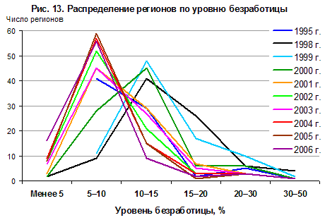 Сравнение гистограммы распределения регионов по уровню безработицы показывает, что потребовались три года экономического роста для возвращения распределения к кривой 1995 г. После этого, несмотря на дальнейший рост экономики, картина почти не менялась (рис. 13). Как известно, в середине 1990-х гг. государственной политики в сфере занятости практически не было, следовательно, показатели безработицы после экономического шока, вызванного дефолтом, вернулись "на круги своя". Позитивное воздействие экономического роста не подкреплялось политикой снижения региональных диспропорций занятости. Кроме того, стагнация региональных рынков труда обусловлена характером экономического роста последних лет – в основном за счет нетрудоемких экспортных отраслей. Для выравнивания региональных различий недостаточно перераспределения бюджетных ресурсов, требуется кардинальное улучшение условий для экономического роста в проблемных регионах.