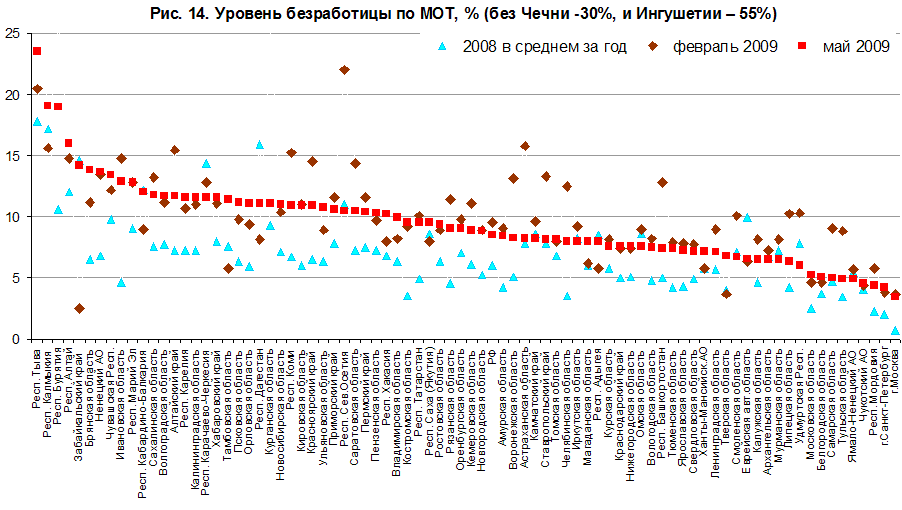 На региональном уровне разброс показателей безработицы за май 2009 г. остается очень сильным (рис. 14), хотя квартальные данные Росстата не вполне репрезентативны для регионов. "Пальму первенства", как и до кризиса, держат слаборазвитые республики. И кризис здесь не при чем, это давняя проблема острого дефицита рабочих мест для растущего населения. Кризисный рост безработицы характерен для двух типа регионов – депрессивных, которые при любом ухудшении экономической ситуации очень уязвимы (Ивановская, Брянская, Псковская области, Забайкальский край и другие восточные регионы), и для регионов со специализацией на машиностроении (Ульяновская область и др.) и черной металлургии, т.к. эти отрасли наиболее пострадали от кризиса.