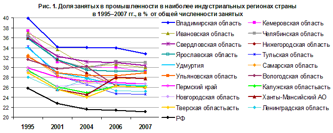 | | Рис. 1. Доля занятых в промышленности в наиболее индустриальных регионах страны в 1995-2007 гг., в % от общей численности занятых |