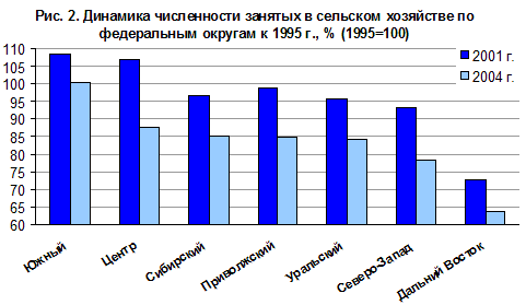 На региональном уровне новая тенденция сокращения занятости в аграрном секторе проявилась в разное время и с разной силой (рис. 2). В маргинальных для сельского хозяйства территориях сокращение началось раньше и было максимальным: в 2004 г. на Дальнем Востоке в сельском хозяйстве осталось менее 2/3 занятых, а в Северо-Западном федеральном округе – 78% занятых по сравнению с 1995 г. В Южном и Центральном федеральных округах численность занятых росла до конца 1990-х годов (за 1995-2000 гг. на 7-8%), причем в Центре основной прирост пришелся на более южные черноземные области. Сокращение аграрной занятости в этих округах началось только с 2000-х гг. и шло быстрее в Центре. В результате усилилась концентрация сельскохозяйственного производства и занятых в нем в наиболее благоприятной природно-климатической зоне, что способствовало росту эффективности аграрного сектора России. Но для сельскохозяйственных регионах юга этот процесс имеет и негативные последствия, в них сохраняется проблема избыточной занятости и низкой производительности труда.