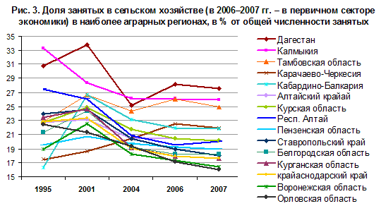 | | Рис. 3. Доля занятых в сельском хозяйстве (в 2006-2007 гг. – в первичном секторе экономики) в наиболее аграрных регионах, в % от общей численности занятых |