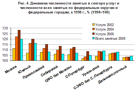 | | Рис. 4. Динамика численности занятых в секторе услуг и численности всех занятых по федеральным округам и федеральным городам, к 1998 г., % (1998=100) |