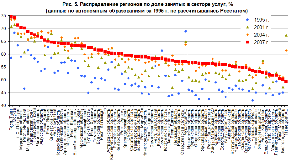 В 2007 г. средняя доля занятых в секторе услуг в стране составила 61%, а диапазон различий по регионам - от 50 до 74%, и за последние годы картина изменилась несущественно. Уже к концу 1990-х гг. в России сформировались три типа регионов с максимальной занятостью в секторе услуг. Во-первых, это крупнейшие агломерации федеральных городов, в которых рынок труда отражает реальную постиндустриальную трансформацию экономики. Во-вторых, слабозаселенные регионы Крайнего Севера с рассредоточенными учреждениями обслуживания, что вынуждает поддерживать повышенную занятость в бюджетных услугах. В-третьих, слаборазвитые республики и автономные округа, где в силу ограниченного предложения других рабочих мест доминирует занятость в услугах бюджетного сектора, финансируемого за счет федеральной помощи. В остальных регионах, и промышленных, и более аграрных, сдвиг в сторону сервисной занятости был более медленным. В 2000-е гг. картина принципиально не менялась, за исключением отдельных регионов (рис. 5). Немногочисленные случаи заметного сокращения доли занятых в секторе услуг объяснялись либо резким ростом добычи нефти (Ненецкий АО), либо ростом занятости в строительстве благодаря притоку бюджетных инвестиций (Чукотский АО в начале 2000-х гг.).