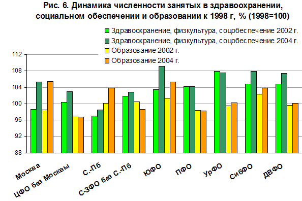 | | Рис. 6. Динамика численности занятых в здравоохранении, социальном обеспечении и образовании к 1998 г, % (1998=100) |
