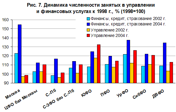| | Рис. 7. Динамика численности занятых в управлении и финансовых услугах к 1998 г., % (1998=100) |