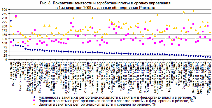 | | Рис. 8. Показатели занятости и заработной платы в органах управления (региональные органы исполнительной власти и территориальные структуры федеральных органов в регионах) в 1-м квартале 2009 г., данные обследования Росстата