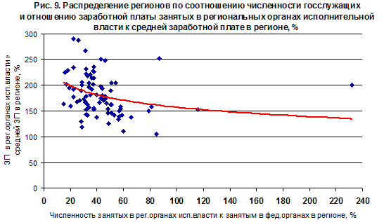 Разрыв заработной платы госслужащих региональной исполнительной власти и средней зарплаты по региону еще выше и составляет в целом по стране 1,6 раз (см. рис. 8). При этом заработки региональных чиновников максимально превышают средние далеко не в самых развитых регионах – в Воронежской и Орловской областях (в 2,9 раз), в Волгоградской, Архангельской. Рязанской областях, Краснодарском крае (2,4- 2,7 раз). Сам по себе разрыв не критичен, если численность госслужащих невелика и появляется возможность лучше оплачивать их высококвалифицированный труд. Можно сопоставить все регионы по двум индикаторам - численности госслужащих региональной исполнительной власти, соотнесенной с численностью федеральных госслужащих в регионе, и разрыву оплаты труда региональных чиновников и средней зарплаты по региону. Слабо выраженная обратная зависимость между двумя индикаторами все же просматривается (см. линию тренда на рис. 9) и в субъектах РФ с относительно меньшей численностью госслужащих региональной исполнительной власти заработки последних сильнее превышают средние по региону, что экономически оправданно.
