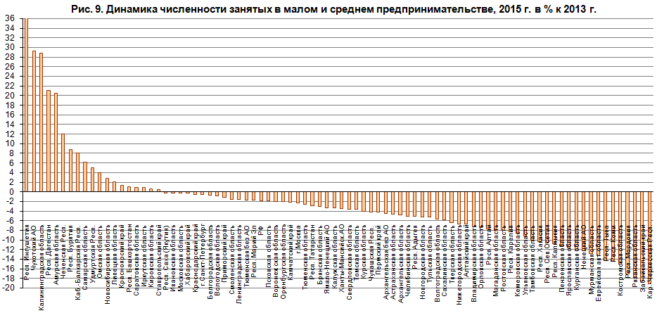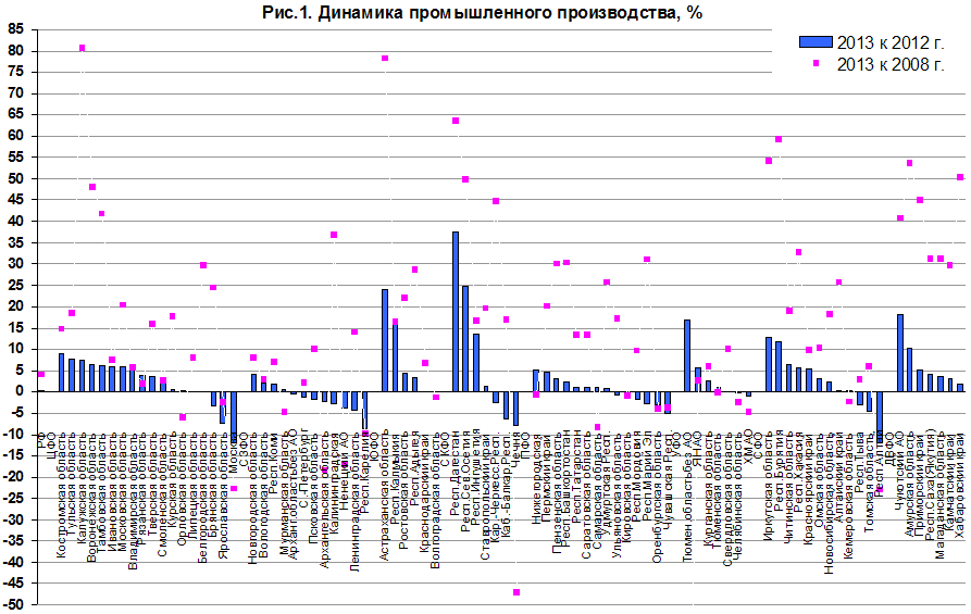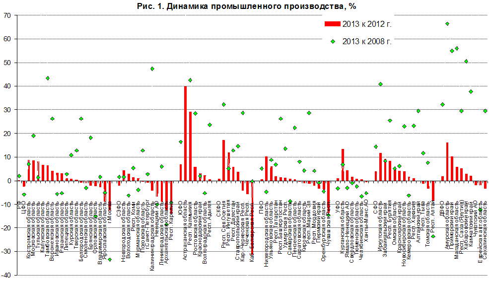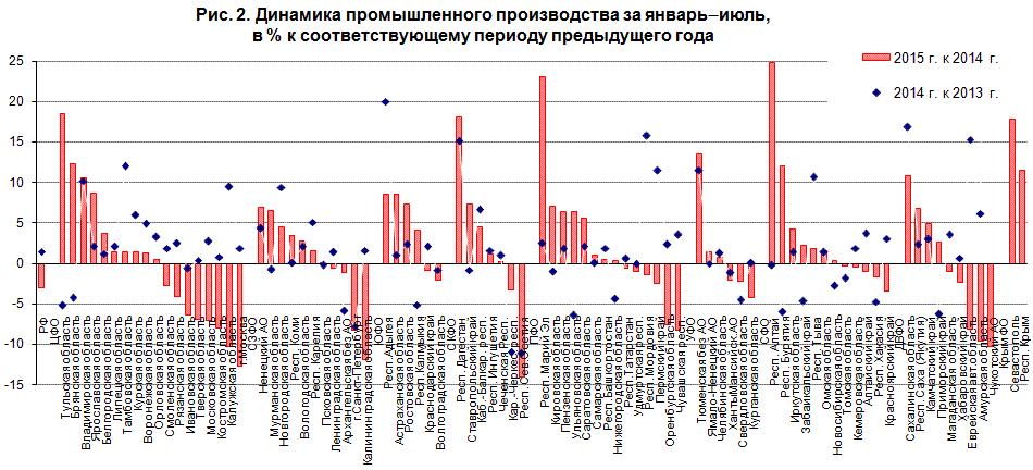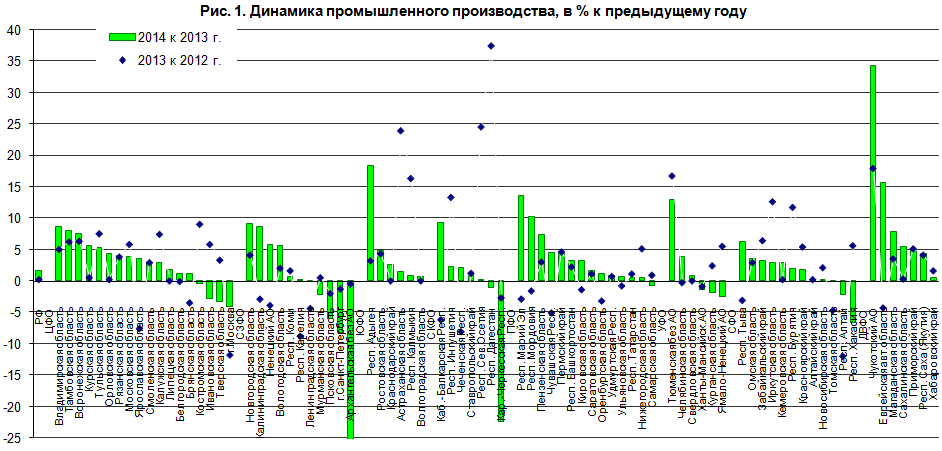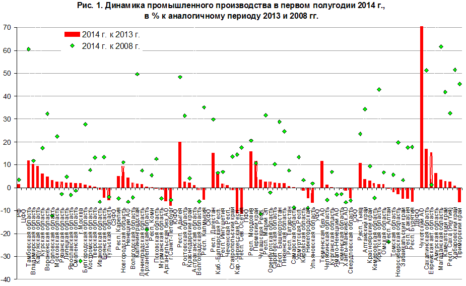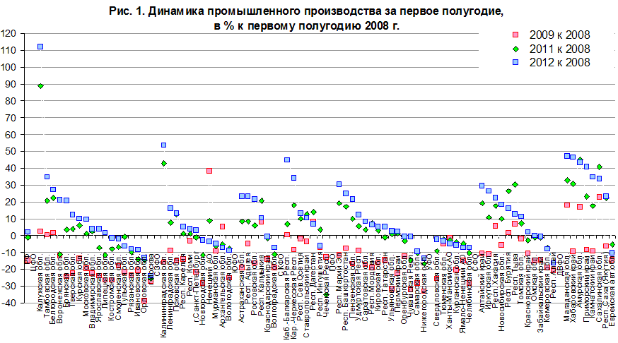 Сильный спад показателей республик Чечня и Алтай малозначим, поскольку в них почти нет промышленного производства. Показатели бурного роста промышленного производства в других слаборазвитых республиках также обусловлены эффектом низкой базы. Этот же эффект обеспечил позитивную динамику промышленности большинства регионов Дальнего Востока.