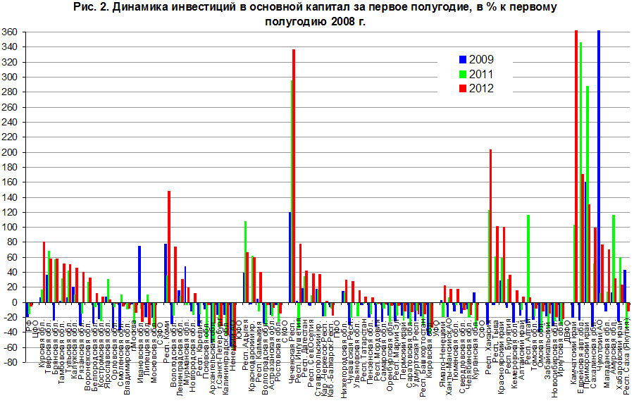 Перспективы развития регионов зависят от инвестиционной активности. В первом полугодии 2012 г. объем инвестиций вырос на 11,6% по сравнению с первой половиной 2011 г. (в сопоставимых ценах). В Вологодской области инвестиции выросли в 2,1 раза, в республике Коми – в 1,8 раза, но самый значительный вклад в общероссийский рост внесли Москва, Ленинградская область, Башкортостан и Красноярский край (рост на 19-25% к предыдущему году). Однако кризисный спад все еще не преодолен, объем инвестиций составляет только 94% по сравнению с первой половиной 2008 г. Из 83 регионов не преодолели спад инвестиций 34, в том числе крупные промышленные регионы Урала и Поволжья, агломерации федеральных городов (рис. 2). Как и в предыдущие годы, по приросту инвестиций от докризисного периода лидирует Дальний Восток и слаборазвитые республики (в первую очередь – Чечня, а также Ингушетия, Дагестан и Тыва), Краснодарский край. Преодолен кризисный спад инвестиций в важнейших регионах ТЭК – автономных округах Тюменской области. Быстро растут инвестиции в регионах с новыми месторождениями нефти (республика Коми, Красноярский край), но не во всех: в Ненецком АО, Сахалинской области и в республике Якутия инвестиционная активность в 2012 г. снижалась.