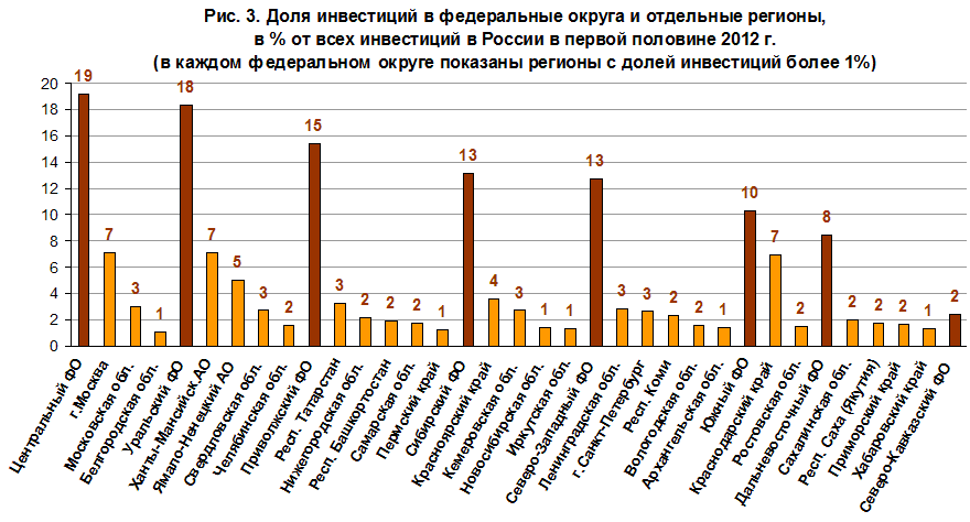 Рис. 3. Доля инвестиций в федеральные округа и отдельные регионы, в % от всех инвестиций в России в первой половине 2012 г. (в каждом федеральном округе показаны регионы с долей инвестиций более 1%) |