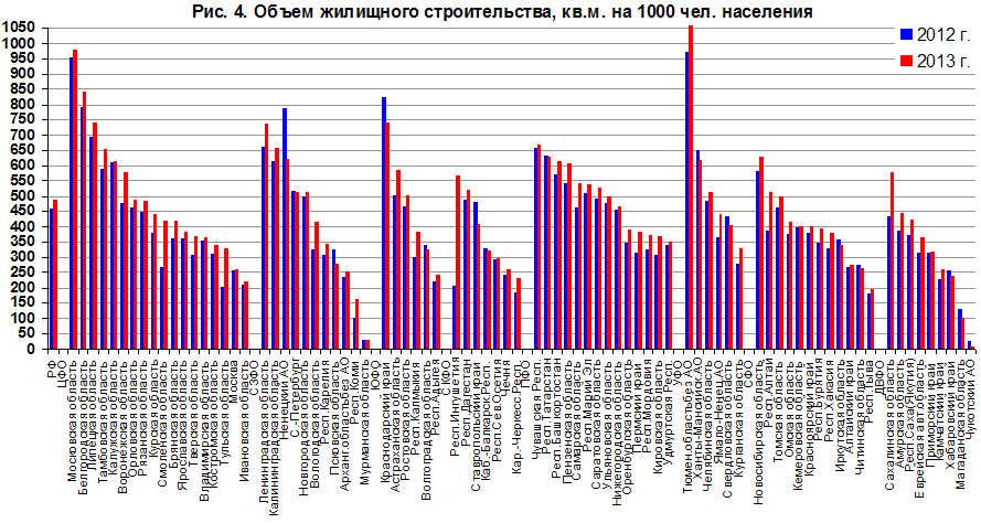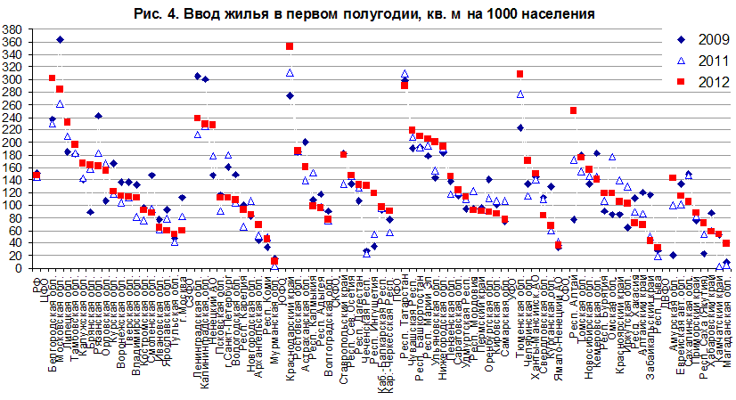 Объем жилищного строительства в первой половине 2012 г. вырос менее чем на 2% по сравнению с предыдущим годом. Однако регионы-лидеры по объему ввода жилья в расчете на 1000 населения, за исключением Татарстана, показали высокие темпы роста – на 12-13% в 2012 г. по сравнению с предыдущим годом, а Белгородская область – на 31% (рис. 4). Явный лидер по вводу жилья – Тюменская область, если считать ее показатель без автономных округов: в первом полугодии 2012 г. в области было введено 593 кв. м на 1000 населения, за два последних года объем ввода жилья вырос в полтора раза. Для сравнения, среднероссийский показатель ввода жилья за весь год (на 1000 населения) вдвое меньше. В 2-6 раз вырос ввод жилья в Ингушетии и Чечне, но скорее всего, это юридическое оформление ввода в эксплуатацию уже построенных домов, что в предыдущие годы почти не делалось. Сильный спад жилищного строительства продолжается в Москве и начался в С.-Петербурге (на 34-38% в первой половине 2012 г. к предыдущему году). Остальные регионы не выделяются ни объемами жилищного строительства, ни его динамикой.