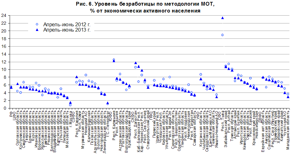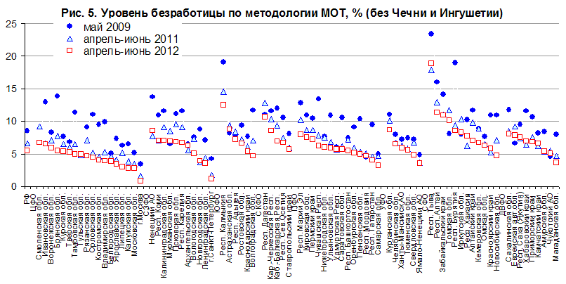 Зарегистрированная безработица в июле 2012 г. снизилась до 1,4% (в августе 2011 г. – 1,8%, в августе 2010 г. – 2,3%). Максимальное снижение имели самые проблемные слаборазвитые республики (Чечня – с 38 до 30%, Ингушетия – с 20,3 до 14,6%, Тыва – с 5,7 до 4,6%). Уже не выделяются повышенным уровнем зарегистрированной безработицы депрессивные регионы и регионы с сильным промышленным спадом в период кризиса 2009 г. В Ивановской области и Забайкальском крае уровень зарегистрированной безработицы за последний год снизился почти на 1 проц. пункт (с 2,7 до 1,8% и с 3,0 до 2,2% соответственно), еще более чем в десятке регионов (Ярославская, Владимирская, Кировская, Самарская, Челябинская, Курганская, Кемеровская области, Пермский край, республики Карелия и Мордовия и др.) – на 0,5 проц. пункта.