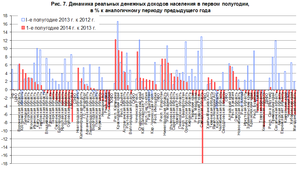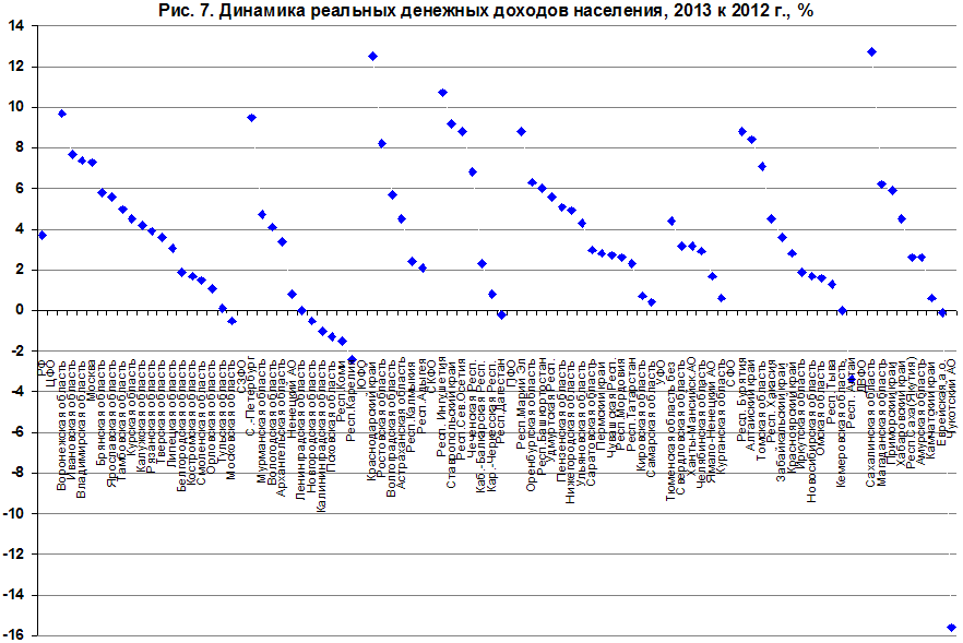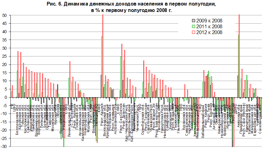 По сравнению с докризисным первым полугодием 2008 г., реальные доходы населения выросли за четыре года только на 7%. Если верить российской статистике, то докризисный уровень доходов населения в реальном выражении не восстановлен в 2/3 регионов Сибири, половине регионов Северо-Запада и Урала, в Рязанской, Ярославской, Ульяновской, Астраханской, Сахалинской областях, в Пермском крае и Чукотском АО (рис. 6). Быстрее же всего росли реальные доходы населения некоторых слаборазвитых республик (Адыгеи, Северной Осетии и Дагестана), Амурской области, большинства областей Центрального федерального округа и части регионов Приволжского, Ленинградской области. Объяснить этот перечень невозможно.