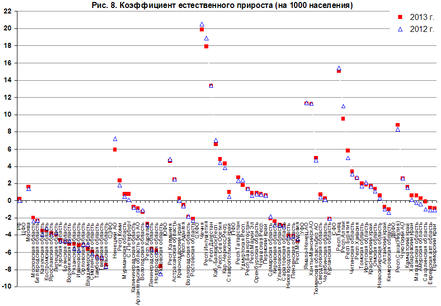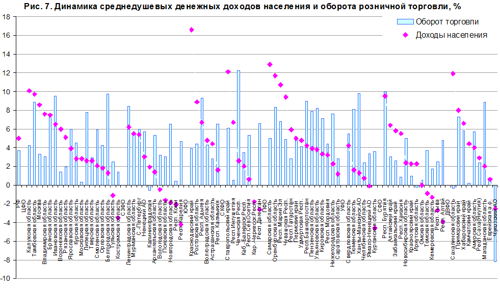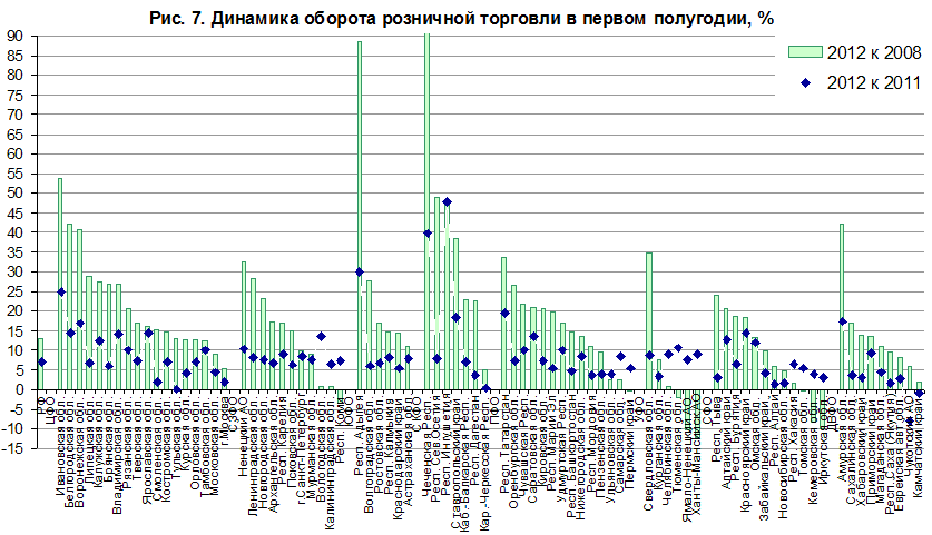 Динамика оборота розничной торговли используется как косвенный индикатор динамики доходов населения. Она показывает, что в 2012 г. потребление росло более устойчиво (на 7% к тому же периоду 2011 г.), среди регионов не встречалась отрицательная динамика. Подавляющее большинство регионов преодолело кризисный спад потребления, за исключением нескольких ресурсодобывающих (рис. 7). В период кризиса и на стадии выхода из него быстрее всего рос оборот розничной торговли в слаборазвитых республиках, особенно в Чечне, Адыгее и Ингушетии, а в 2012 г. регионов с быстро растущим оборотом торговли стало значительно больше.