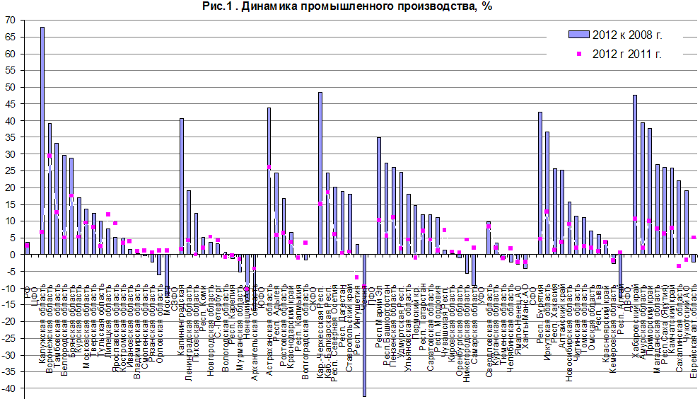 В целом по России кризисный спад промышленного производства был преодолен еще в 2011 г., показатели 2012 г. на 4% выше докризисного 2008 г. Региональная динамика остается разнородной. В 13 регионах производство ниже докризисного уровня (рис. 1). Причины разные. В Москве продолжается деиндустриализация экономики, в отличие от С.-Петербурга, где промышленное производство росло за счет ввода новых автосборочных предприятий. Орловская область не может выйти из кризиса и постепенно превращается в депрессивный регион. Почти не росло промышленное производство в депрессивных Владимирской, Курганской и Кировской областях. Медленно выходят из кризиса крупные и более развитые Нижегородская и Самарская области, их машиностроение недостаточно конкурентоспособно, хотя сами эти области нельзя назвать депрессивными. Застой сохраняется в Мурманской области из-за выработанности старых минеральных ресурсов и отсутствия новых проектов развития. Такая же ситуация в ведущих нефтегазодобывающих автономных округах Тюменской области и в Оренбургской области, где падает добыча нефти и газа на старых месторождениях и к тому же снизился глобальный спрос на газ. В Ненецком АО пройден пик добычи нефти на недавно освоенных месторождениях. Поскольку объем промышленного производства в Ненецком АО превышает 40% от всей Архангельской области, снизились показатели и области в целом. Застойное состояние промышленности сохранялось в большинстве регионов черной металлургии (Вологодская, Челябинская, Кемеровская области), устойчиво развивалась только Липецкая область.