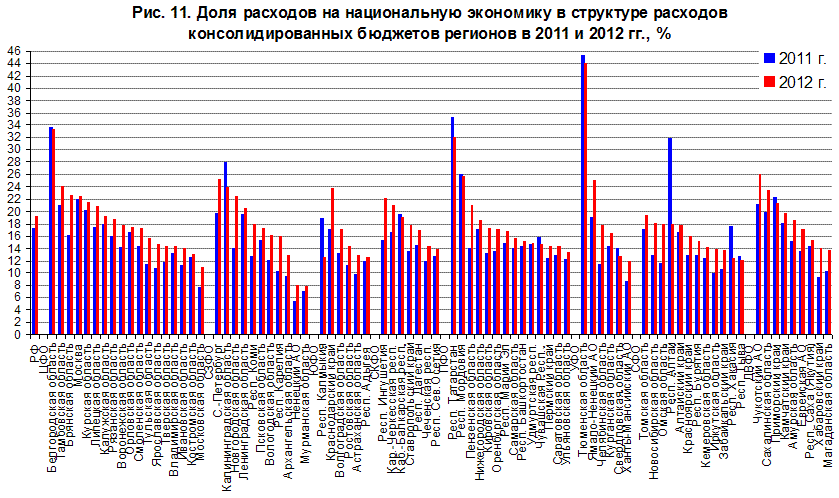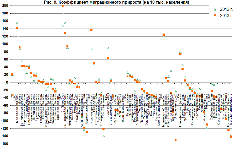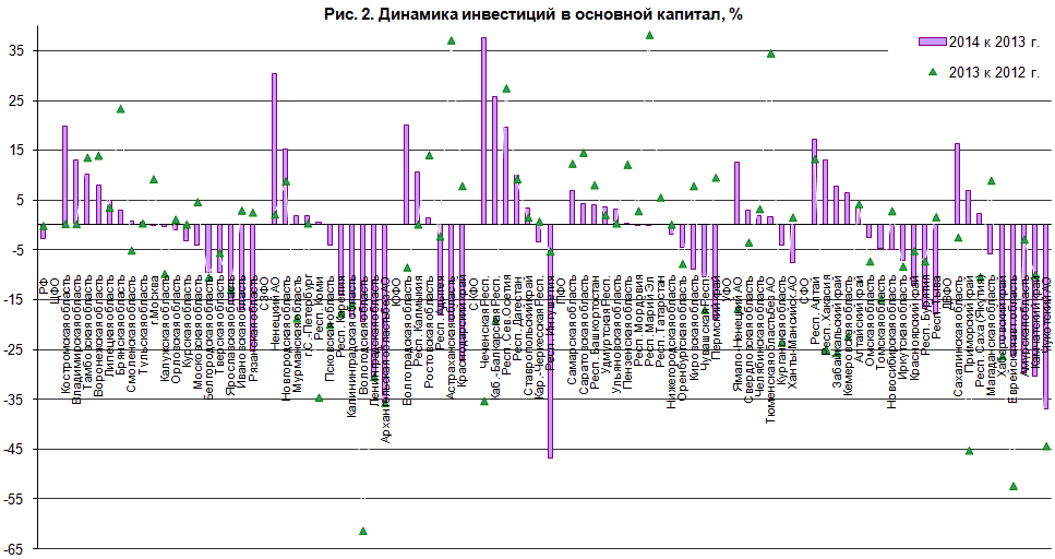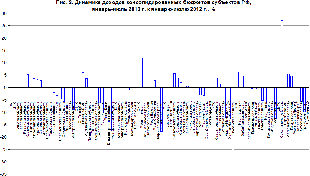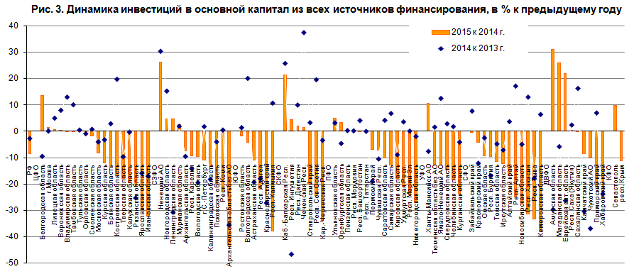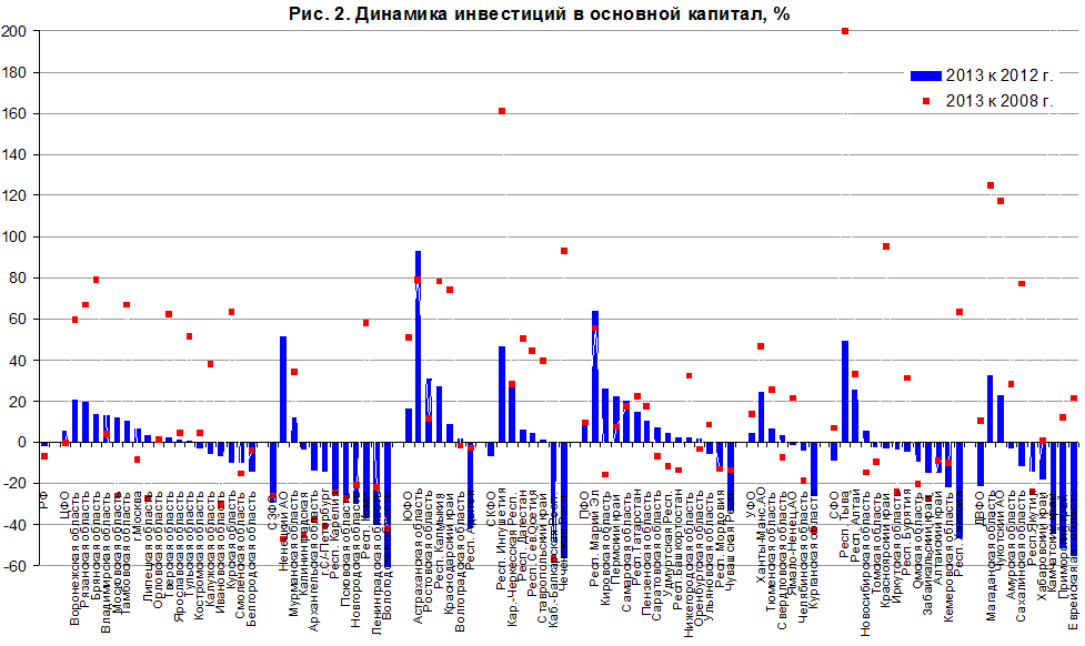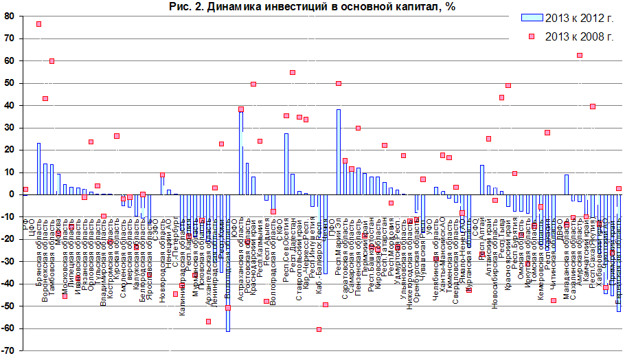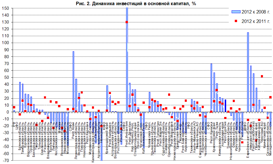 В 2012 г. позитивную динамику к 2011 г. имели 70% регионов, при этом самые высокие темпы роста инвестиций демонстрировали в основном слаборазвитые и депрессивные регионы (эффект низкой базы). Среди более развитых значительным ростом инвестиций отличались некоторые металлургические и угольные регионы (Вологодская, Кемеровская области), с новыми месторождениями нефти (Красноярский край, республика Якутия) и все газодобывающие (ЯНАО, Астраханская и Оренбургская области). Устойчиво росли инвестиции в Татарстане (на 9% к предыдущему году). Среди регионов новой индустриализации значительный рост инвестиций сохранился только в Калужской области (на 15%). В агломерациях федеральных городов динамика прошедшего года была разнонаправленной: в Москве и Московской области инвестиции выросли (на 9 и 4% соответственно), а в С.-Петербурге они сократились на 7%. Из несырьевых и менее развитых регионов выделялись Ульяновская и Пензенская области, проводящие активную политику привлечения инвесторов, выросли инвестиции и в Ростовскую область. Как и ожидалось, резко сократились инвестиции в регионах юга Дальнего Востока (Приморский край – на 44%, Амурская область –на 20%, Еврейская авт.область – на 12%) после завершения крупных проектов – саммита АТЭС и строительства первой ветки восточного нефтепровода.