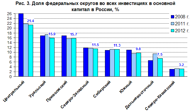География инвестиций по федеральным округам изменилась несущественно (рис. 3). Устойчиво сокращалась доля Центрального ФО, в 2012 г. сократилась доля Уральского ФО и особенно заметно – Дальнего Востока. На Северный Кавказ инвестиции не идут, несмотря на широко разрекламированные планы развития экономики республик юга.