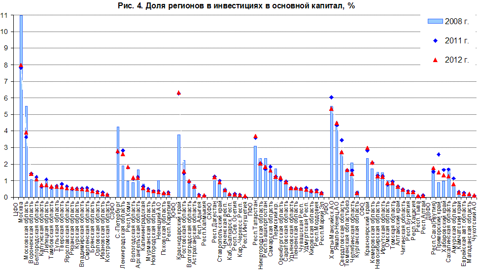 Распределение инвестиций по регионам за 2008-2012 гг. (рис. 4) показывает, что сдвиги пропорций федеральных округов обусловлены динамикой крупнейших агломераций и ведущих сырьевых регионов, получающих самые большие инвестиции. Сокращение доли Центрального ФО обусловлено непреодоленным спадом инвестиций в столичную агломерацию: доля Москвы снизилась с 11 до 8% от всех инвестиций в России, Московской области – с 5,5% до 4%. В Северо-Западном ФО снижение доли лидера – С.-Петербурга – отчасти компенсировано ростом инвестиций в республике Коми и Ленинградской области (до 2012 г.). Стабильная доля Приволжского ФО обеспечена ростом инвестиций в Татарстане при худшей динамике других развитых регионов. В Уральском ФО стагнируют или снижаются инвестиции в нефтегазодобывающие автономные округа Тюменской области. В Сибирском ФО в последние два года возросла доля инвестиций в Красноярский край и Кемеровскую область. В Южном ФО инвестиции выросли исключительно за счет Краснодарского края. Динамика фантастическая: в 2012 г. Краснодарский край получил 6,3% от всех инвестиций в РФ (в 2008 г. – 3,8%), значительно опередив Ханты-Мансийский АО и приблизившись к Москве.