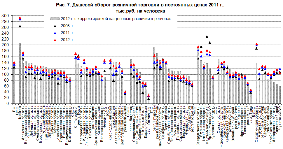 Душевые показатели оборота розничной торговли в регионах различаются более чем в 10 раз, но если учитывать региональные различия цен в регионах – то в 5,8 раз. Для 2012 г. дополнительно рассчитан показатель душевого оборота, учитывающий ценовые различия в регионах (использована стоимость фиксированного набора товара и услуг для межрегиональных сопоставлений Росстата), он изображен столбиками на рисунке 7, показатели без корректировки на ценовые различия даны значками. При корректировке на уровень цен выигрывают более «дешевые» регионы Центра, Поволжья и Юга, а показатели восточных и северных регионов снижаются, поскольку в них жизнь дороже и цены на товары выше. Для сопоставимости душевые показатели пересчитаны в постоянных ценах 2011 г. Устойчивый рост потребления – очевидный тренд 2012 г. практически во всех регионах, этому способствовал масштабный рост потребительского кредитования (более чем на 40%).