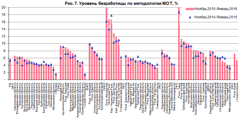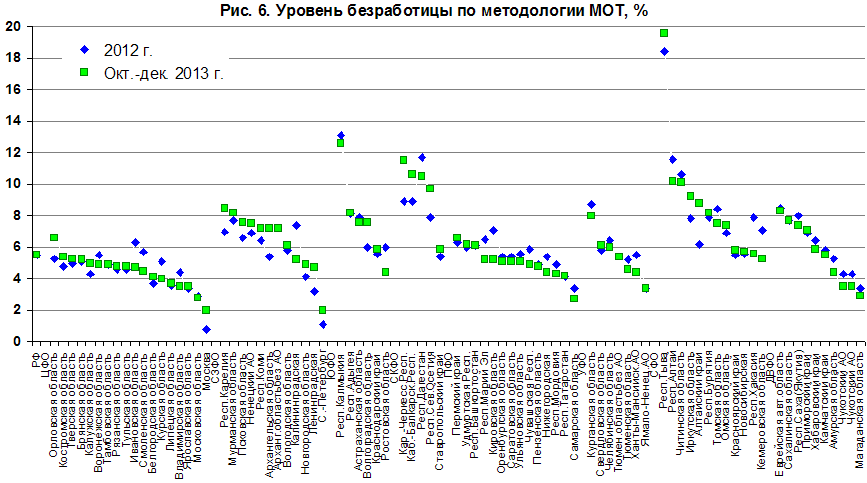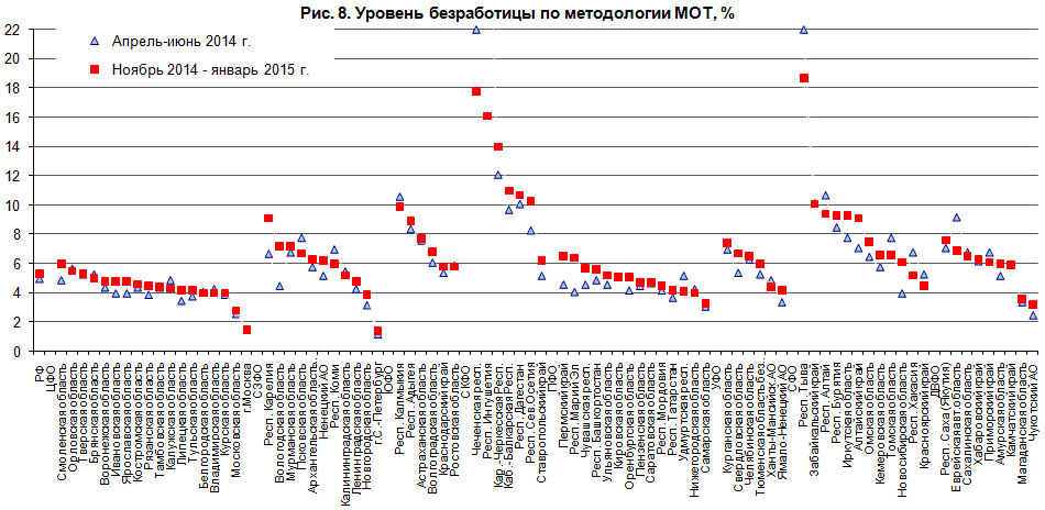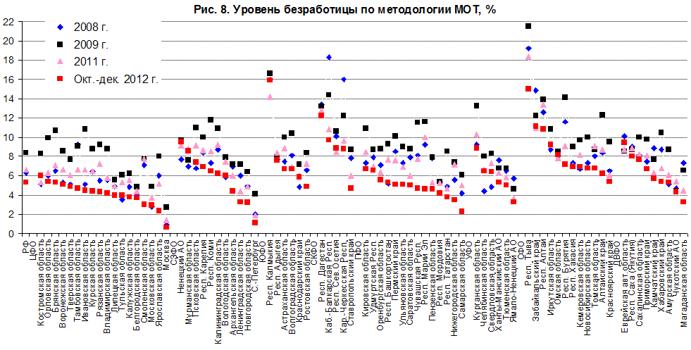 Рис. 8. Уровень безработицы по методологии МОТ, % (без Чечни и Ингушетии) |