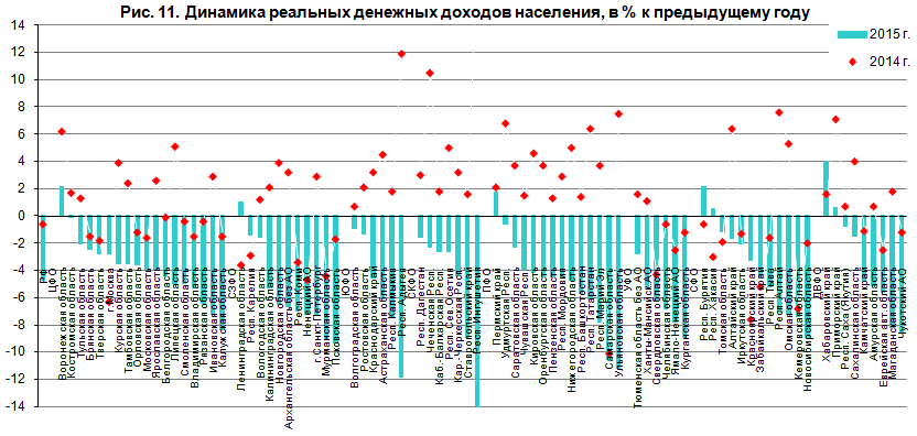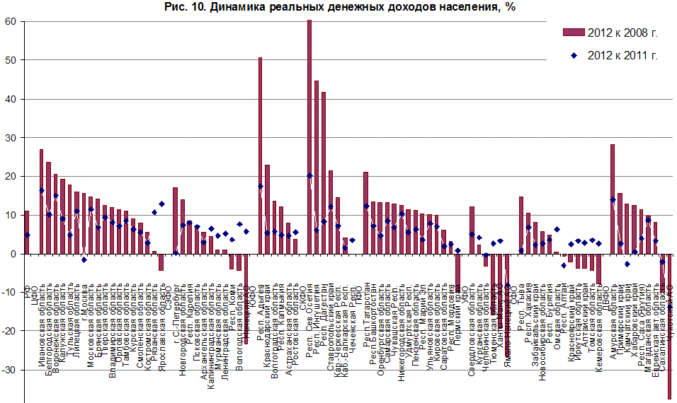 Денежные доходы населения в 2012 г. выросли на 4,8% к 2010 г., что существенно лучше, чем в предыдущем году (1% в 2011 г. к 2010 г.). Наиболее высокими темпами роста (более 10%) отличались регионы с низким исходным уровнем доходов населения (Ивановская, Воронежская, Рязанская, Амурская области, Ставропольский край, часть республик Северного Кавказа) или сильным их спадом в предыдущие кризисные годы (Ярославская, Нижегородская и Московская области), а также более развитые регионы с динамичным ростом экономики (Калужская, Белгородская, Липецкая области, республика Татарстан) (рис. 10). В пяти регионах доходы населения в 2012 г. сократились (Чукотский АО, Ямало-Ненецкий АО, Сахалинская область, Камчатский край и республика Алтай), это либо регионы ТЭК с падением промышленного производства, либо крайне удаленные и высокодотационные субъекты РФ.
