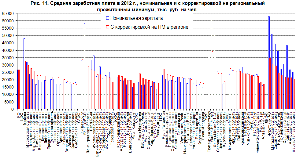 Рис. 11. Средняя заработная плата в 2012 г., номинальная и с корректировкой на региональный прожиточный минимум, тыс. руб. на чел. |
