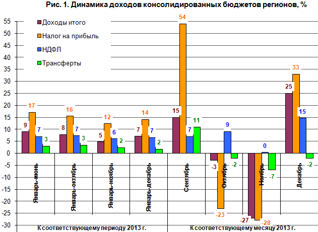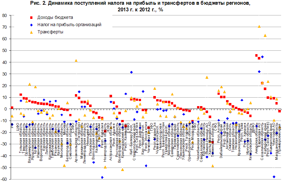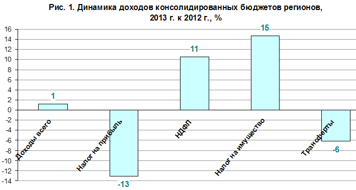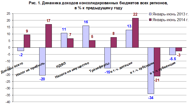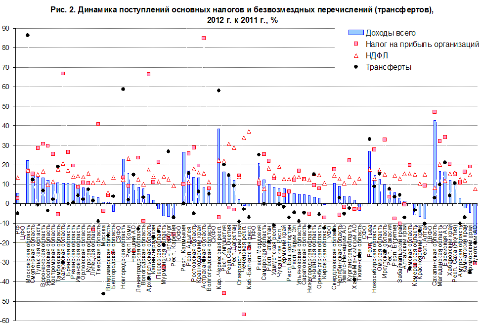 Рис. 1. Динамика доходов консолидированных бюджетов регионов, поступлений основных налогов и трансфертов, в % к тому же периоду предыдущего года |