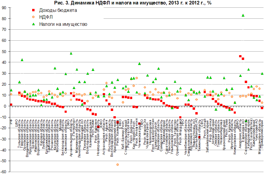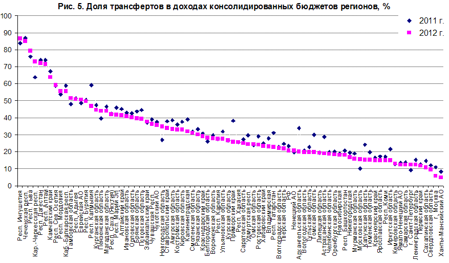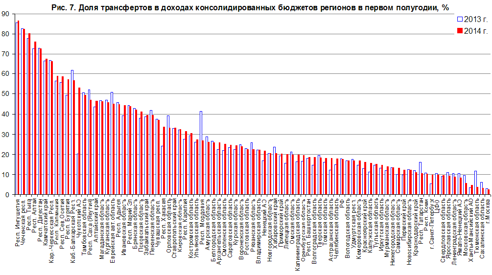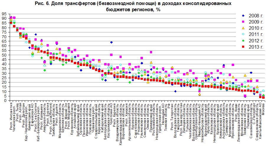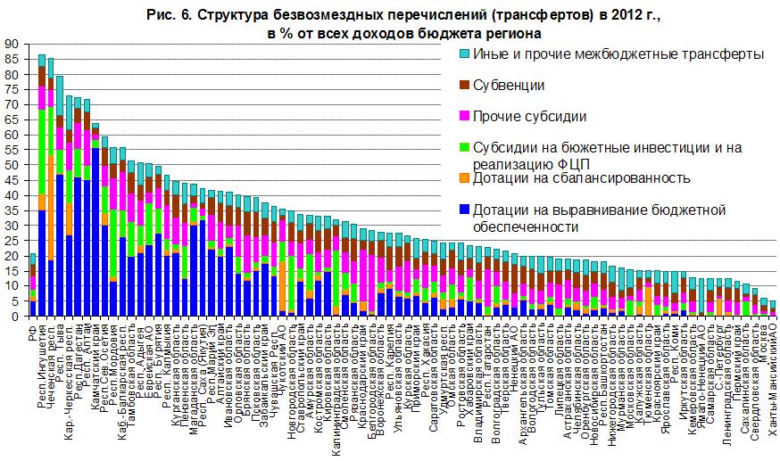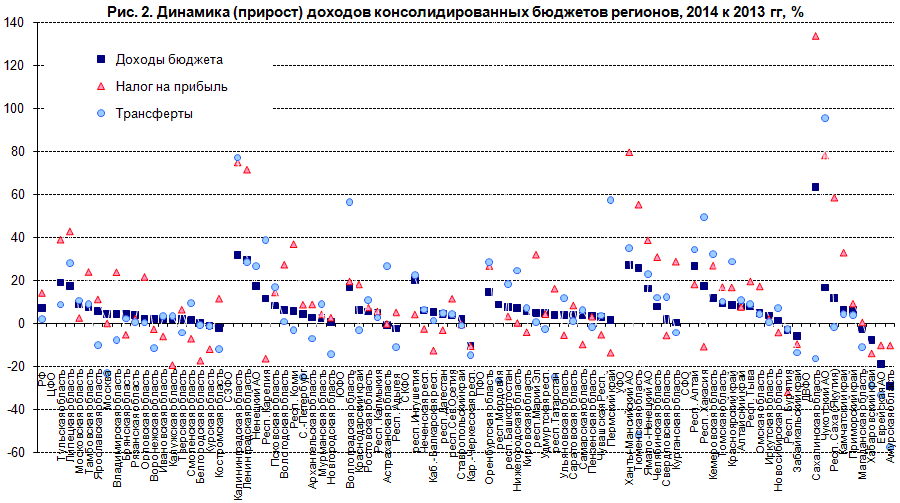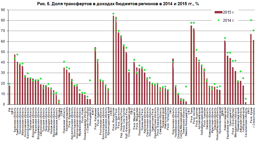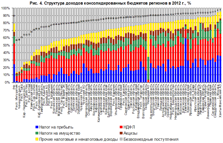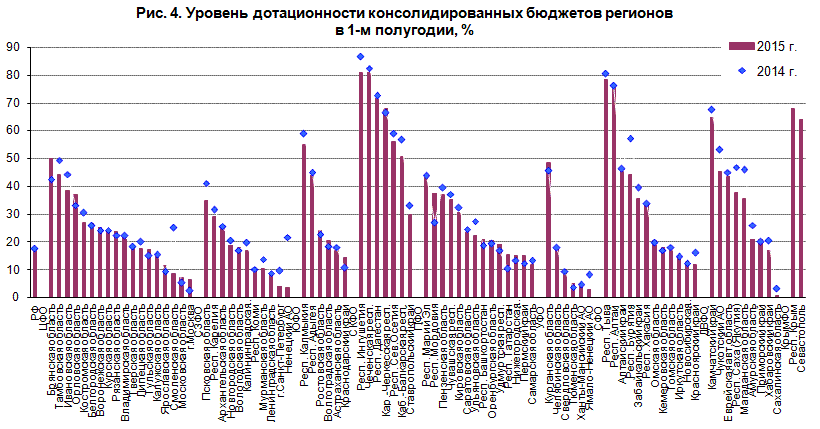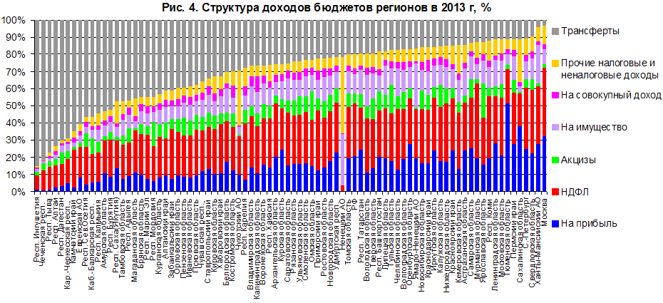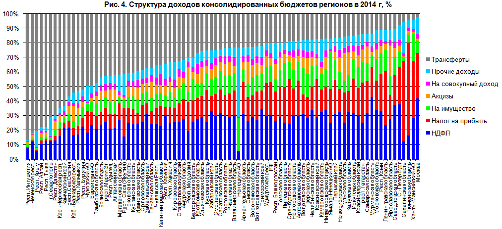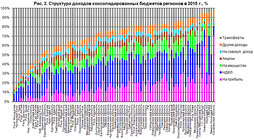 Структурные различия доходов бюджетов весьма устойчивы, за исключением отдельных регионов. Главным налогом для большинства регионов является НДФЛ (рис. 3). Доля налога на прибыль в 2015 г. максимальна в Сахалинской области (71%) за счет роста платежей нефтегазодобывающих компаний, в Тюменской области (59%) за счет перераспределяется части налога на прибыль из автономных округов, и в Ленинградской (39%). Этот налог более важен также для ХМАО, Липецкой области, Татарстана, Красноярского края и Чукотского АО. В слаборазвитых республиках налог на прибыль составляет не более 1-5% доходов бюджета. Доля налога на имущества максимальна в Ямало-Ненецком (37%), где резко сократились поступления налога на прибыль в 2015 г. из-за политики "Газпрома", в Ненецком АО (24%), она выше средней в регионах с крупными промышленными активами. Вклад акцизов в доходы бюджета максимален в регионах, производящих подакцизные товары – алкоголь, пиво, бензин и др. (Мордовия, Кабардино-Балкария, Омская, Ярославская и Калужская области). Но самые сильные различия – в уровне дотационности регионов: доля трансфертов в доходах их бюджетов различается от 2% в Сахалинской области до 85% в Ингушетии (см. ниже). Это следствие огромных различий налоговой базы субъектов РФ.