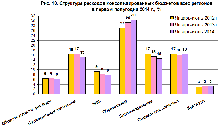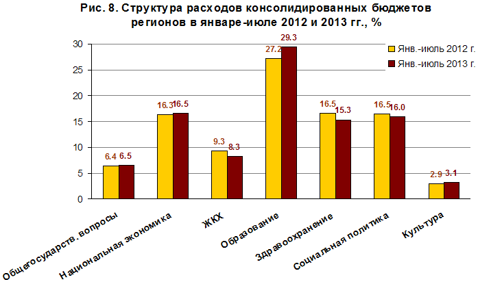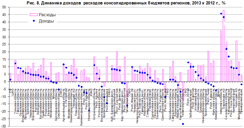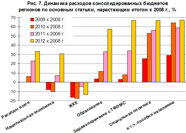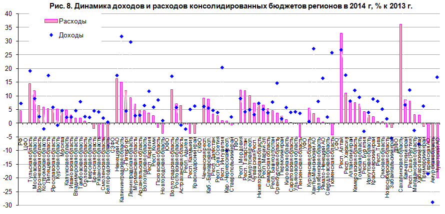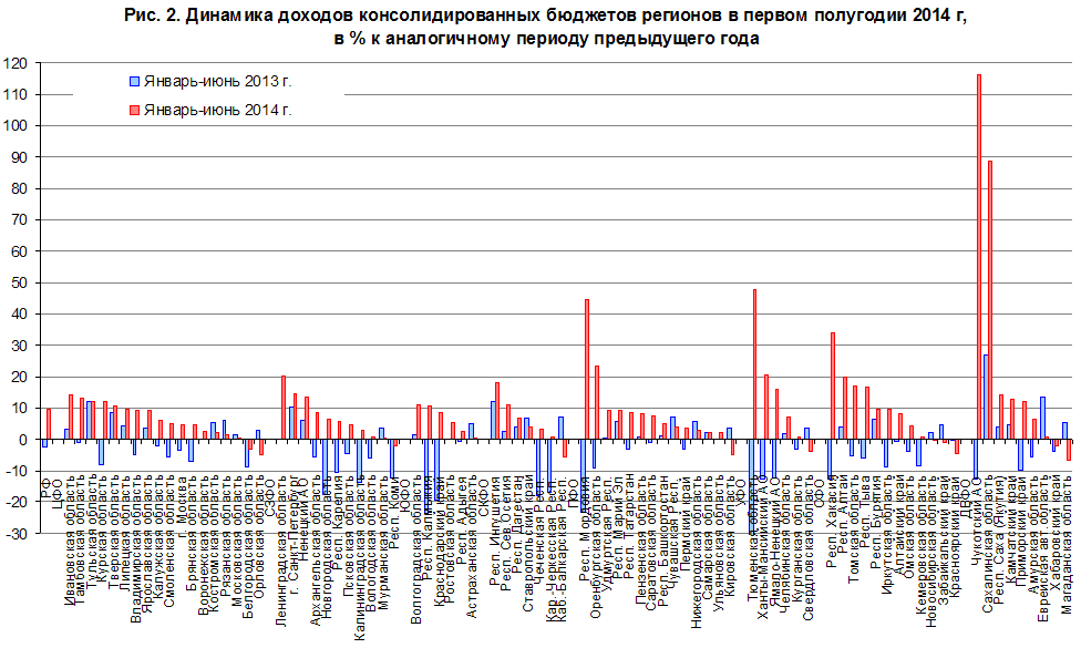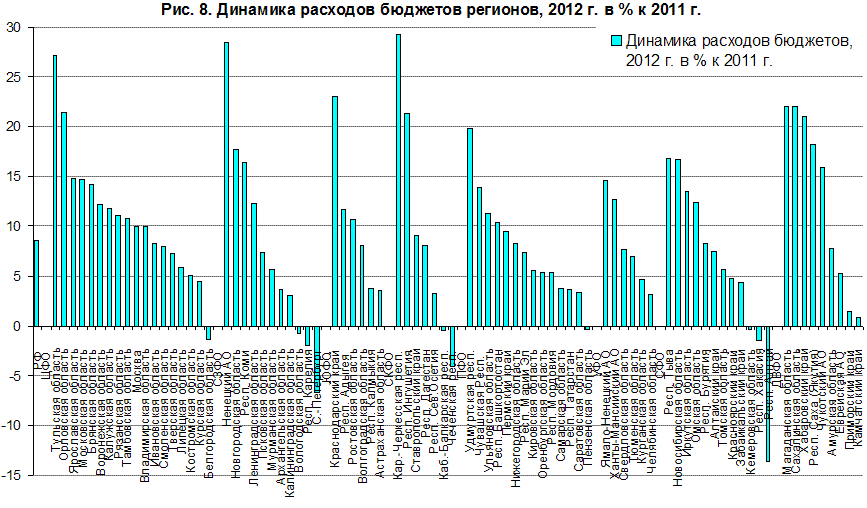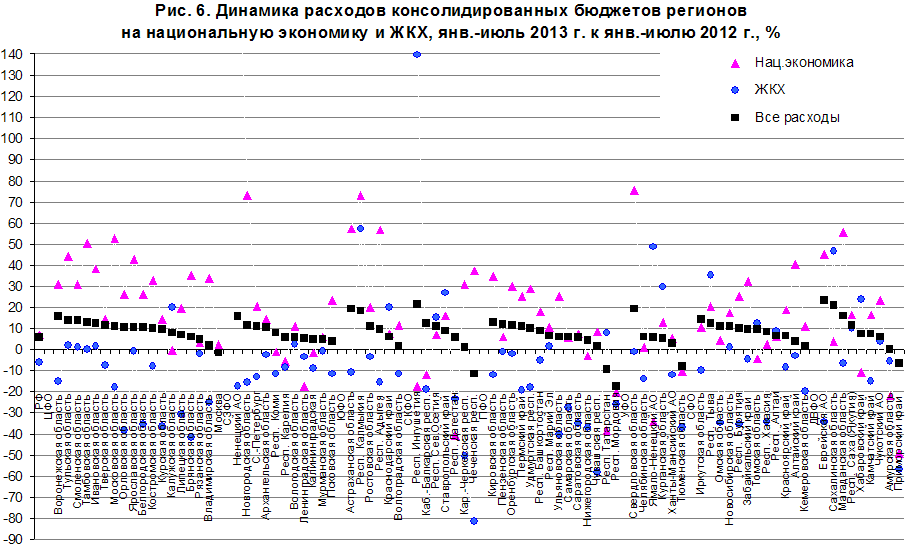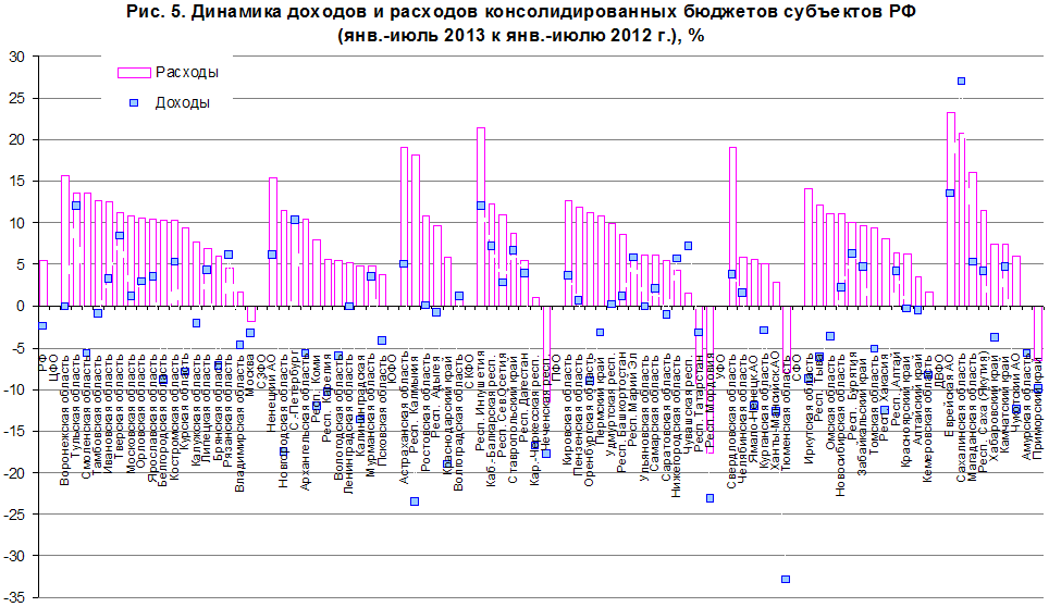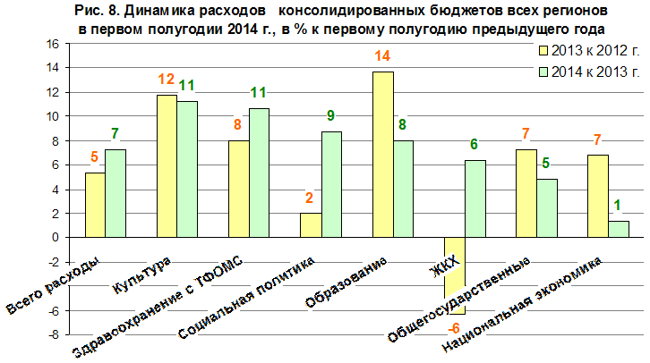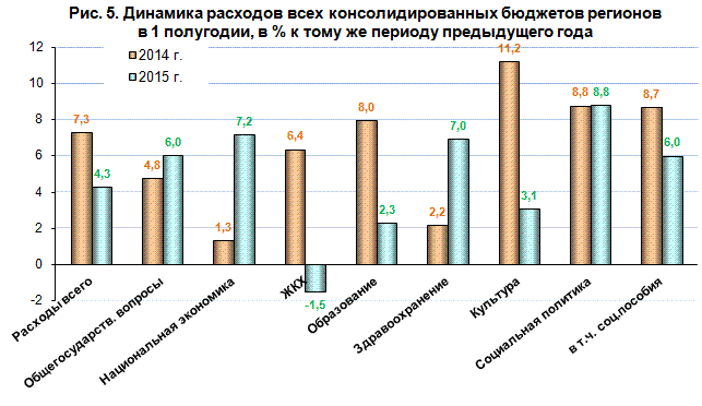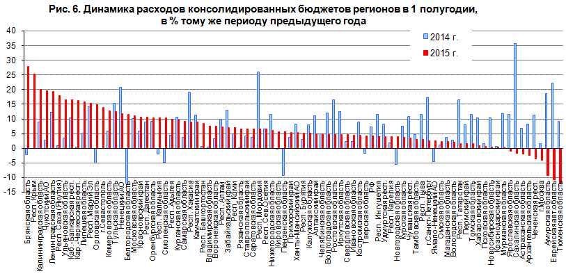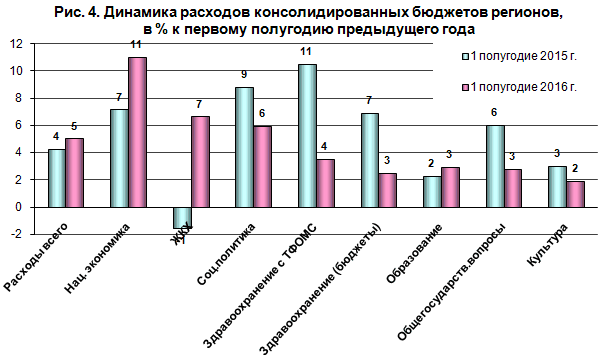 Рис. 4. Динамика расходов консолидированных бюджетов регионов, в % к первому полугодию предыдущего года |