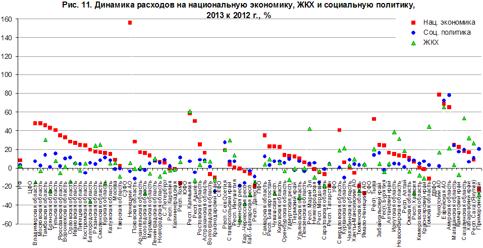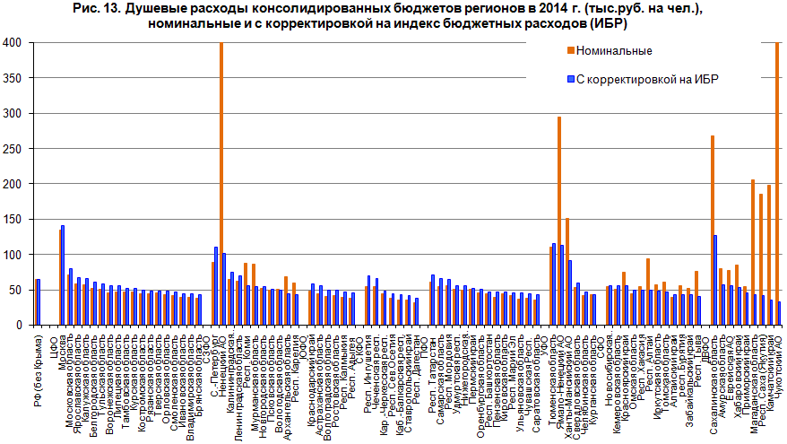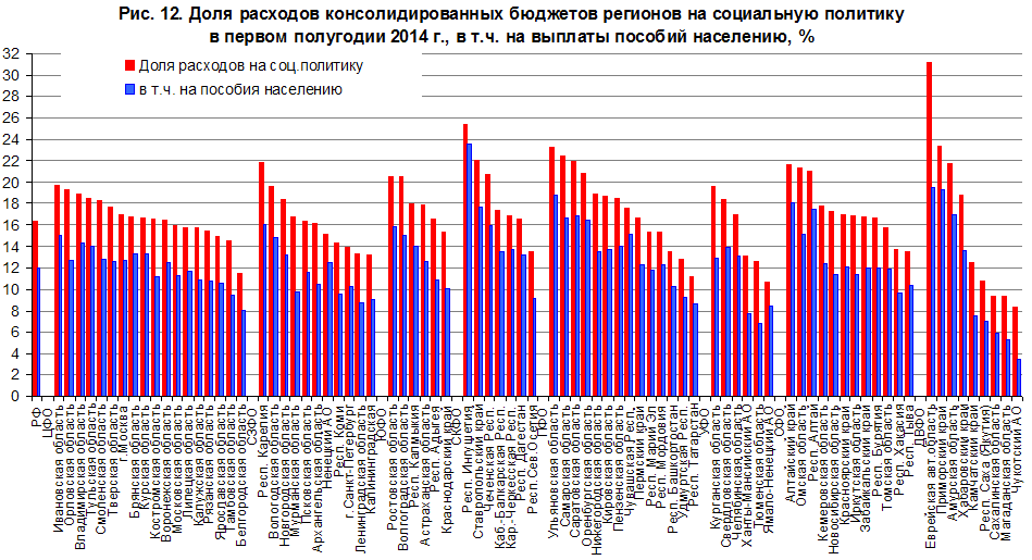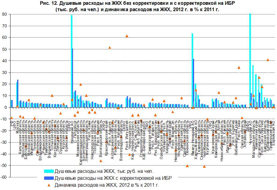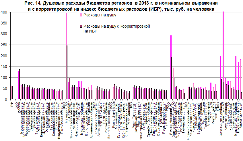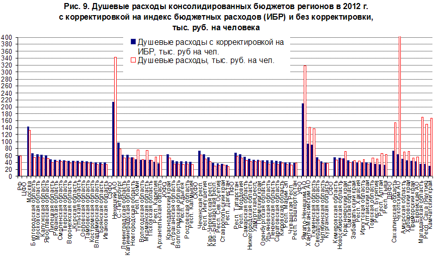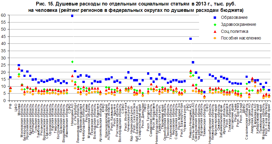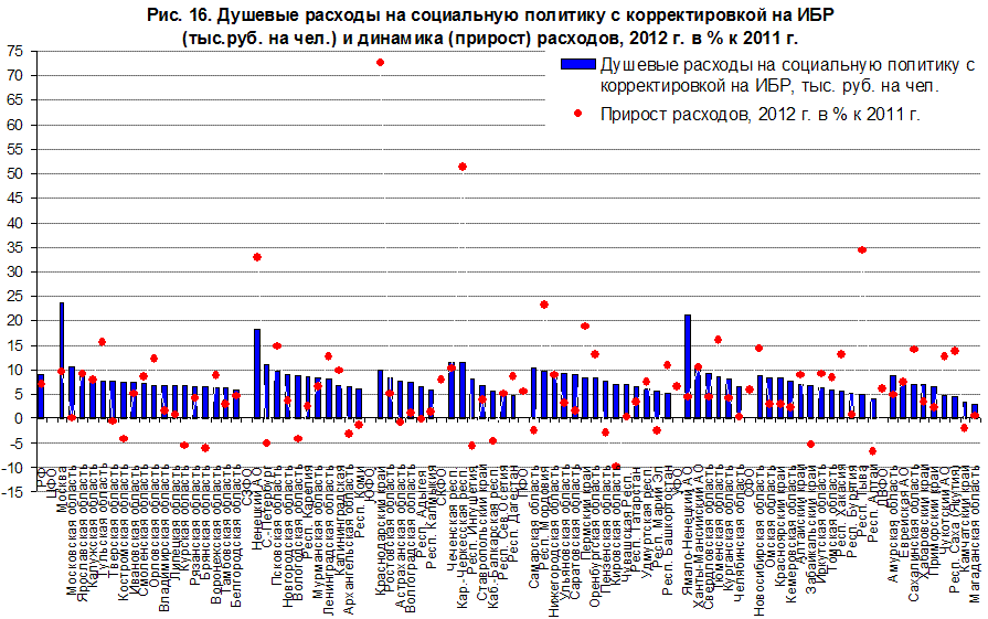 Душевые расходы на социальную политику с корректировкой на ИБР различаются в подавляющем большинстве регионов не более чем в два раза, за исключением самых "богатых" – Москвы, Ямало-Ненецкого и Ненецкого АО. Ханты-Мансийский АО и С.-Петербург, обычно попадающие в группу лидеров по другим душевым социальным расходам, отстают от лидеров в два раза. "Богатая" Москва наращивала расходы на соцполитику (на 10% в 2012 г.). Огромные средства идут на доплаты к пенсиям неработающим московским пенсионерам (122 млрд. руб. в 2012 г., что сопоставимо с бюджетом Пермского края или Иркутской области) и на многочисленные категориальные пособия и льготы, которые выделяются вне зависимости от доходов получателей социальной помощи. Душевые расходы на социальную политику минимальны в регионах северо-востока (Магаданская и Камчатская области, Якутия и Чукотский АО) и в слаборазвитых республиках Сибири, но это во многом следствие корректировки расходов на очень высокий ИБР.