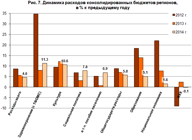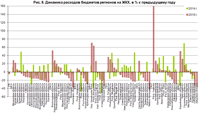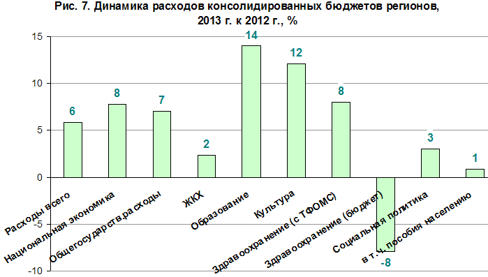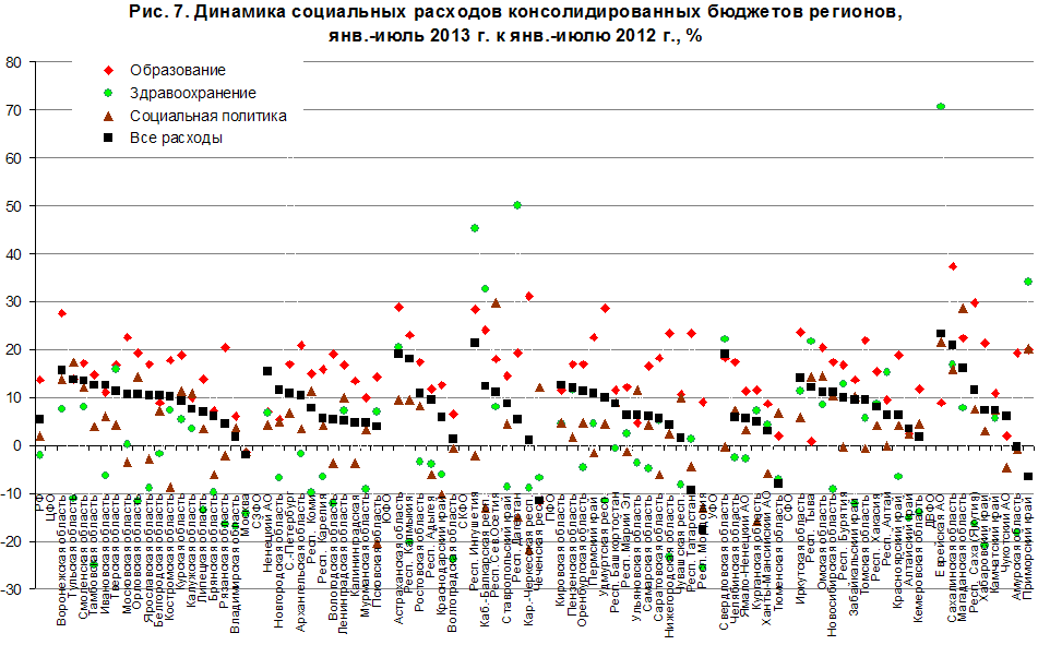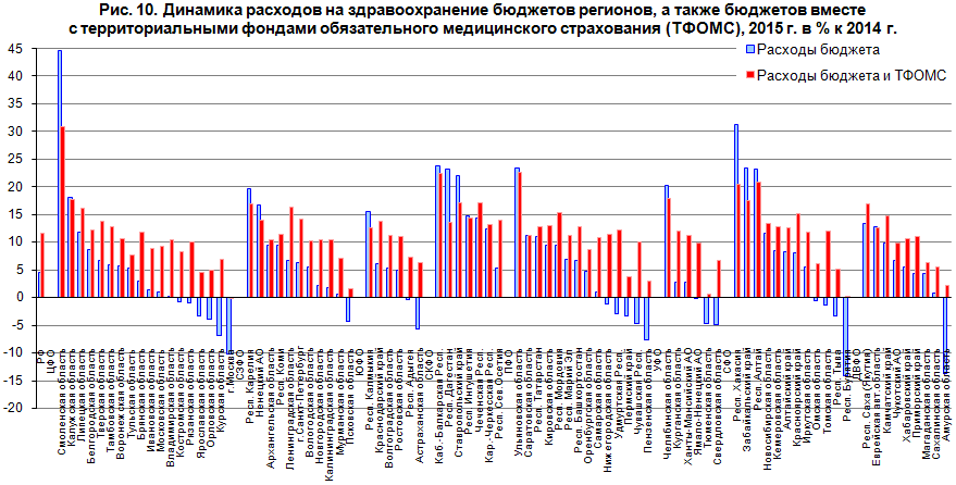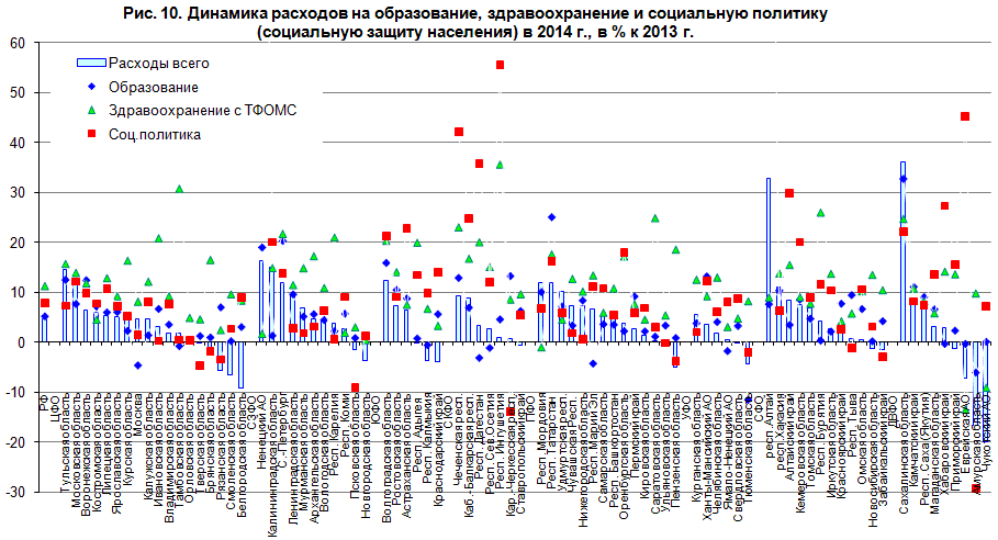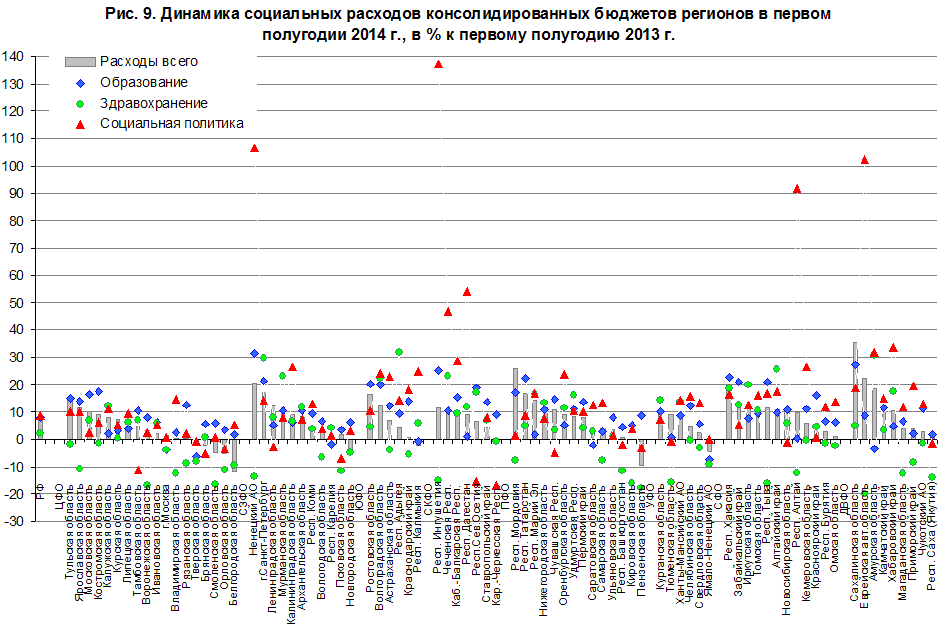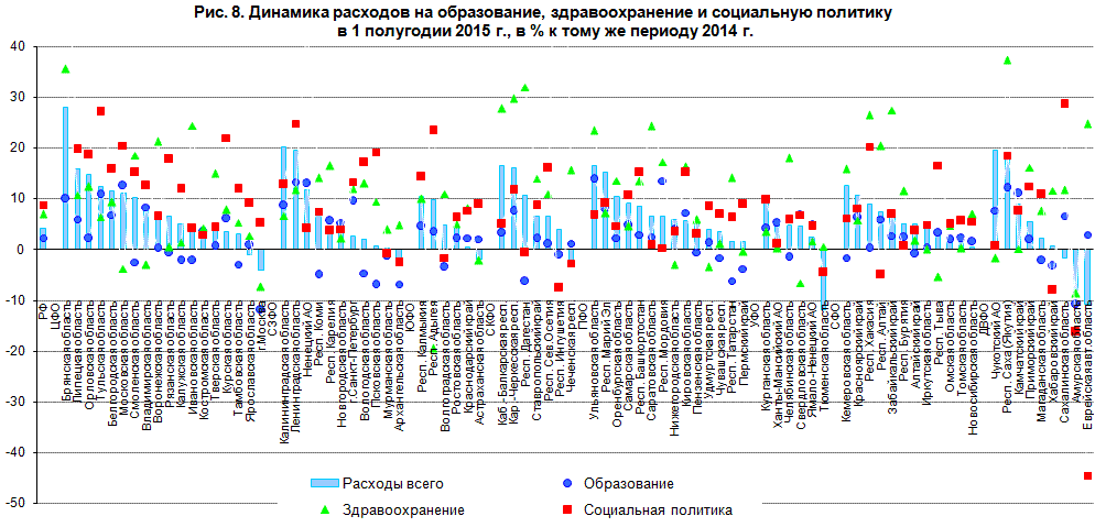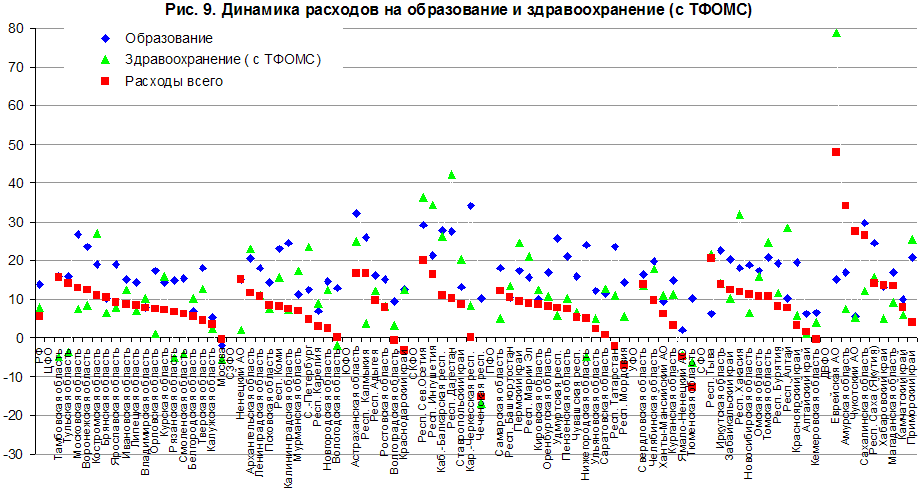 Расходы консолидированных бюджетов регионов на здравоохранение рассматриваются вместе с расходами территориальных фондов обязательного медицинского страхования, поскольку доля последних составляет больше половины всех расходов на здравоохранение в регионах. Суммарные расходы на здравоохранение сократились в 28 регионах, максимальный спад имела Ингушетия (на 45%), что трудно объяснимо. В Калмыкии и Еврейской автономной области расходы на здравоохранение сократились на 12%, в Ненецком АО, Псковской области и Калмыкии – на 7-9%. Причины не всегда объективные, только в Калмыкии, Марий Эл и Ненецком АО сокращение важнейших видов социальных расходов связано со значительным снижением доходов бюджета региона.