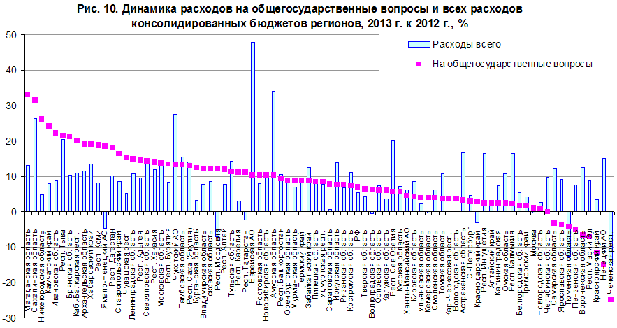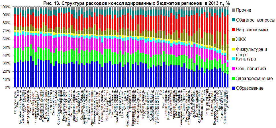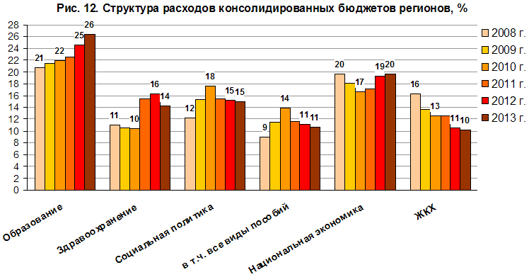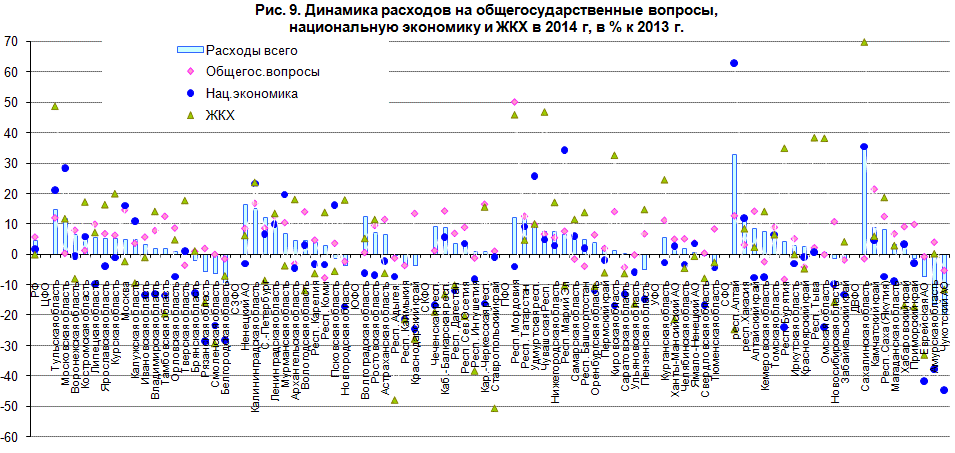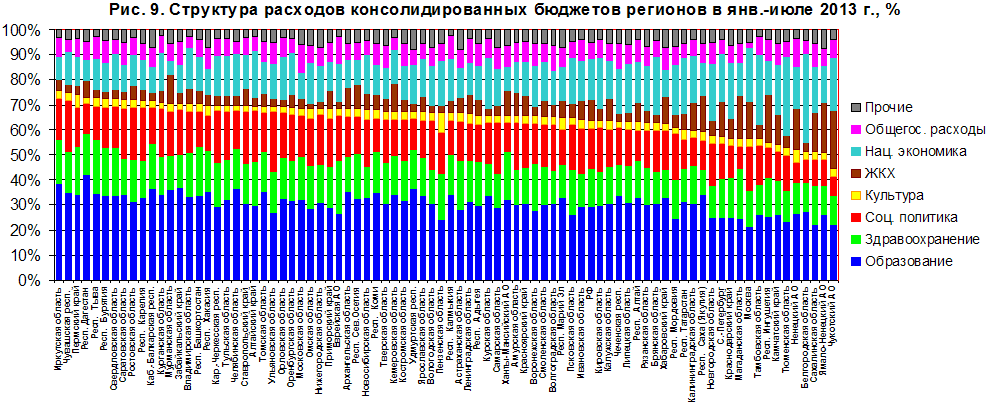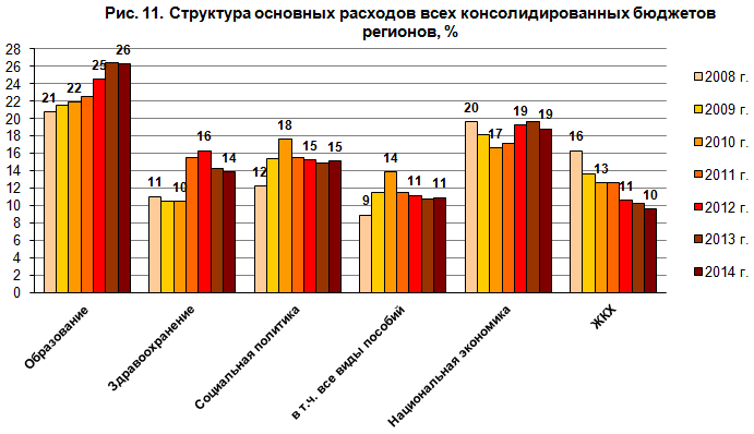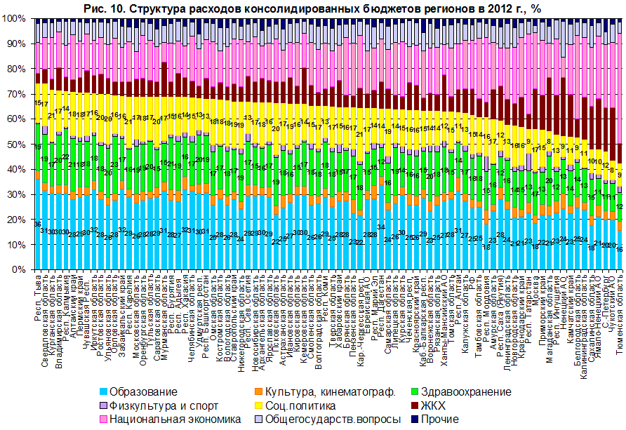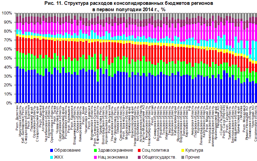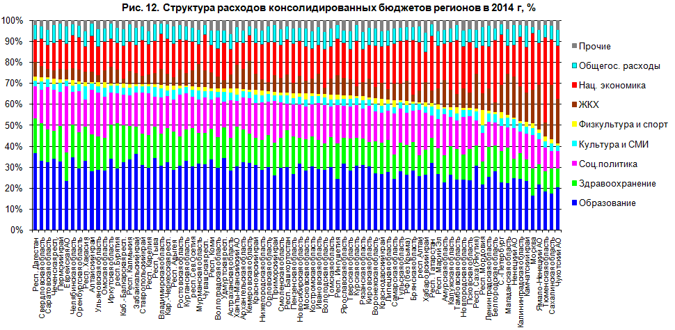 Расходы консолидированных бюджетов регионов на здравоохранение рассматриваются вместе с расходами территориальных фондов обязательного медицинского страхования, поскольку доля последних составляет больше половины всех расходов на здравоохранение в регионах. Суммарные расходы на здравоохранение сократились в 28 регионах, максимальный спад имела Ингушетия (на 45%), что трудно объяснимо. В Калмыкии и Еврейской автономной области расходы на здравоохранение сократились на 12%, в Ненецком АО, Псковской области и Калмыкии – на 7-9%. Причины не всегда объективные, только в Калмыкии, Марий Эл и Ненецком АО сокращение важнейших видов социальных расходов связано со значительным снижением доходов бюджета региона.